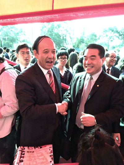 秘魯中資企業(yè)協(xié)會副會長、中石油秘魯國家公司總經(jīng)理陳金濤到我校展臺與賽云秀書記親切交談