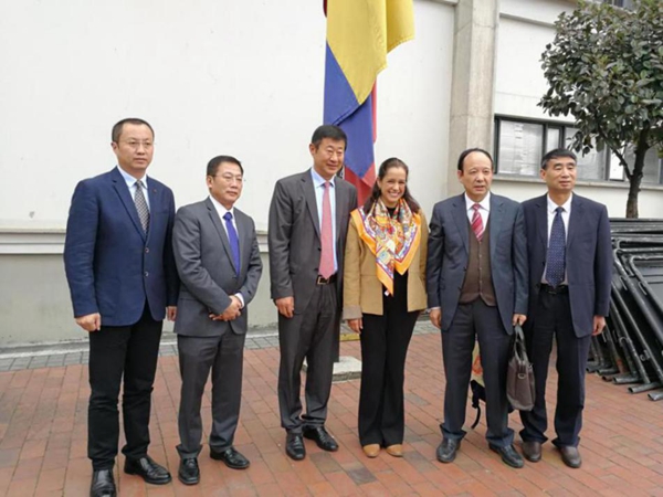 中國駐哥倫比亞大使李念平、國家留學基金管理委員會副秘書長王勝剛、哥教育部外交部文化司長哈拉與我校代表合影