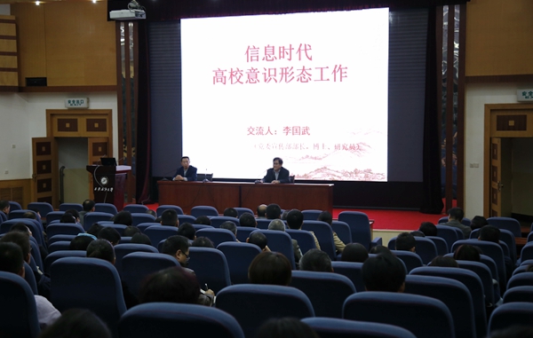 10月20日下午,校黨委委員、宣傳部部長(zhǎng)李國(guó)武在雁塔校區(qū)學(xué)術(shù)報(bào)告廳為我校教職工作了題為《信息時(shí)代高校意識(shí)形態(tài)工作》的培訓(xùn)。全校處、科級(jí)干部,人文學(xué)院、馬克思主義學(xué)院教師,學(xué)生工作處、團(tuán)委相關(guān)工作人員以及全體輔導(dǎo)員300余人參加了培訓(xùn)。