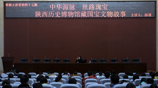 12月14日晚,由合作發(fā)展處、校團(tuán)委共同主辦的第47期明德大講堂之《中華源脈 絲路瑰寶——陜西歷史博物館藏國(guó)寶文物故事》在新校區(qū)圖書館弘石學(xué)術(shù)報(bào)告廳舉辦。陜西歷史博物館科研管理處處長(zhǎng)、中共陜西省委宣傳部理論講師團(tuán)特聘專家楊瑾老師擔(dān)任主講,新校區(qū)近四百余名學(xué)生聽取了講座。