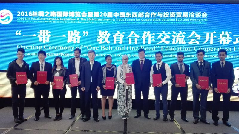 5月13日下午,2016絲綢之路國際博覽會“一帶一路”教育合作交流會開幕式在西安喜來登酒店舉行。陳軍斌副校長作為受邀嘉賓出席開幕式,我校獲得“三秦外國留學(xué)生獎學(xué)金”的留學(xué)生代表上臺領(lǐng)獎。