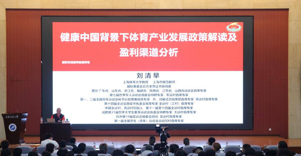當(dāng)晚,劉清早教授作客“明德大講堂”,在鄠邑校區(qū)圖書(shū)館弘石學(xué)術(shù)報(bào)告廳為師生帶來(lái)了題為《健康中國(guó)背景下體育產(chǎn)業(yè)發(fā)展政策解讀及盈利渠道分析》的專(zhuān)題講座。本次講座由體育學(xué)院和校團(tuán)委主辦,體育學(xué)院黨總支書(shū)記茍毅飛,保衛(wèi)(部)處、武裝部副部(處)長(zhǎng)袁坤等參加報(bào)告會(huì),學(xué)院專(zhuān)業(yè)教師代表,教學(xué)辦、學(xué)工辦工作人員及全校400余名學(xué)生共同聆聽(tīng)了講座。報(bào)告會(huì)由體育學(xué)院院長(zhǎng)李壽邦主持。