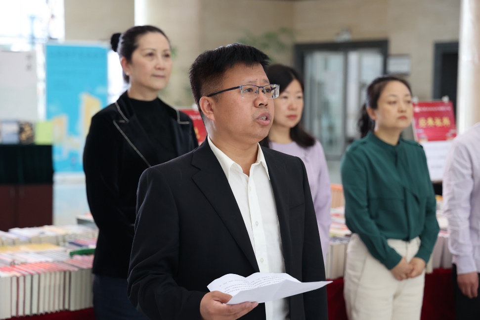 張驍勇在致辭中向本次活動的順利舉辦表示祝賀,對圖書館長期以來不斷創(chuàng)新形式、豐富內(nèi)容、組織開展大學生閱讀推廣工作給予了充分肯定。他引用了高爾基、康德、愛因斯坦等名人名言,鼓勵全校師生多讀書、讀好書,把讀書學習當成一種生活態(tài)度、一種工作責任、一種精神追求,自覺養(yǎng)成閱讀習慣,真正使讀書學習成為人生的重要組成部分,為推動我校的書香校園建設(shè)再立新功。