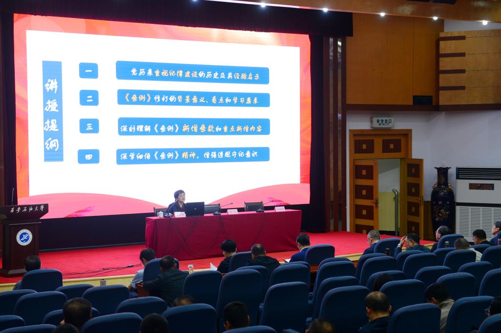 會(huì)上,李曉燕教授以“開(kāi)展黨紀(jì)學(xué)習(xí)教育 強(qiáng)化遵規(guī)守紀(jì)意識(shí)”為題,圍繞學(xué)習(xí)新修訂的《條例》,從介紹修訂過(guò)程,闡述修訂意義,聚焦《條例》總則、政治紀(jì)律、組織紀(jì)律、廉潔紀(jì)律、群眾紀(jì)律、工作紀(jì)律、生活紀(jì)律等,解讀《條例》修訂內(nèi)容,提出貫徹落實(shí)新《條例》有效舉措等方面,作了專題輔導(dǎo)報(bào)告。報(bào)告重點(diǎn)突出,觀點(diǎn)鮮明,資料詳實(shí),分析深刻,為進(jìn)一步學(xué)習(xí)貫徹《條例》理清了思路、啟迪了思考。