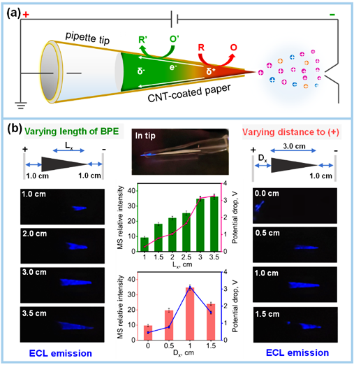 圖1.源內(nèi)紙基質(zhì)雙極性電化學(xué)-質(zhì)譜反應(yīng)裝置及電化學(xué)反應(yīng)過(guò)程魯米諾發(fā)光信號(hào)比較