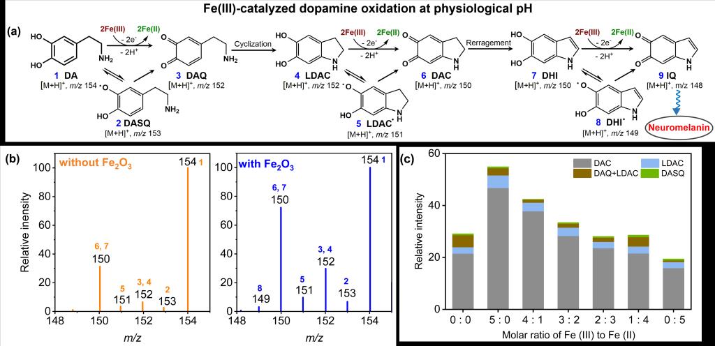2.生理pH值條件下,源內(nèi)紙基質(zhì)雙極性電化學(xué)-質(zhì)譜技術(shù)對(duì)Fe(III)催化多巴胺的反應(yīng)機(jī)理研究