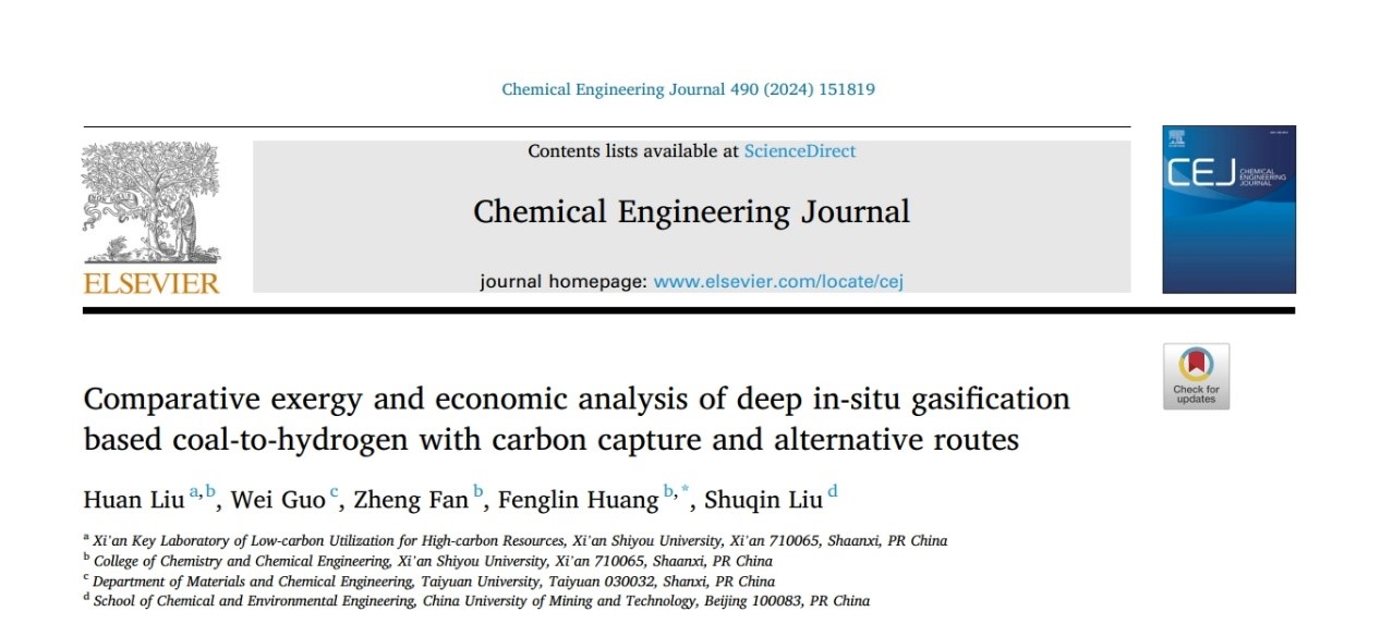近日,我?;瘜W(xué)化工學(xué)院黃風(fēng)林科研團(tuán)隊(duì)以青年教師劉歡為第一作者、黃風(fēng)林為通訊作者,西安石油大學(xué)為第一署名單位在工程技術(shù)與化工領(lǐng)域最有影響力的三大頂級刊物之一《Chemical Engineering Journal》(JCR、中科院分區(qū)雙一區(qū)TOP期刊,IF=15.1)上發(fā)表題為《Comparative exergy and economic analysis of deep in-situ gasification based coal-to-hydrogen with carbon capture and alternative routes》的高水平論文。