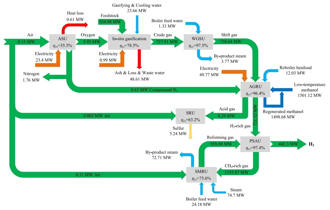 深部煤炭原位氣化制氫作為一種潛在的規(guī)模化技術(shù)路線,工業(yè)化應(yīng)用前利用熱力學(xué)手段分析其能量轉(zhuǎn)化、利用過程的特點(diǎn),預(yù)測系統(tǒng)用能的薄弱環(huán)節(jié),可為后續(xù)工藝過程、工藝參數(shù)耦合優(yōu)化提供指導(dǎo)。與現(xiàn)有基于化石能源路線間效率、經(jīng)濟(jì)性等方面的定量化分析是提高競爭力,明確技術(shù)可行性與應(yīng)用前景的核心關(guān)鍵。