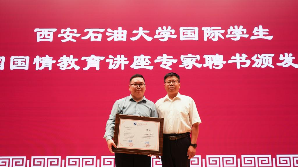 隨后,張驍勇分別為本次中國國情教育講座專家西北大學(xué)絲綢之路研究院副院長(zhǎng)席會(huì)東副教授、陜西省民俗學(xué)會(huì)副會(huì)長(zhǎng)劉國鋒頒發(fā)“西安石油大學(xué)國際學(xué)生中國國情教育講座專家”聘書。