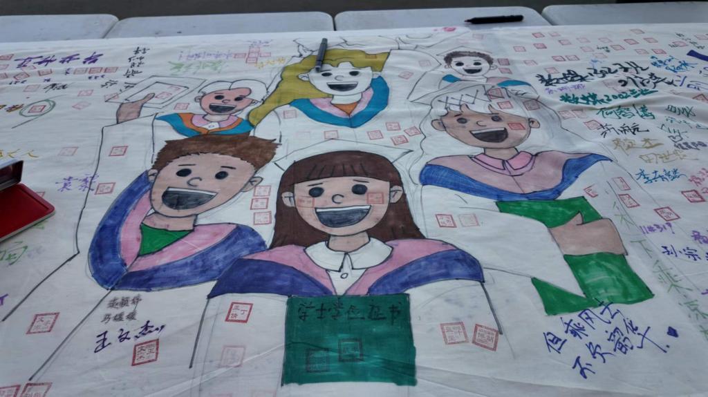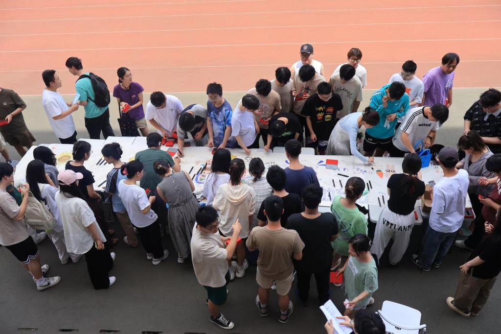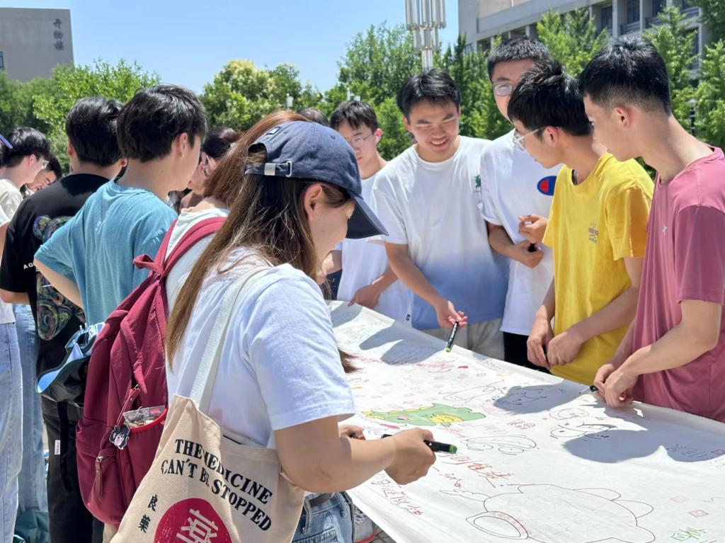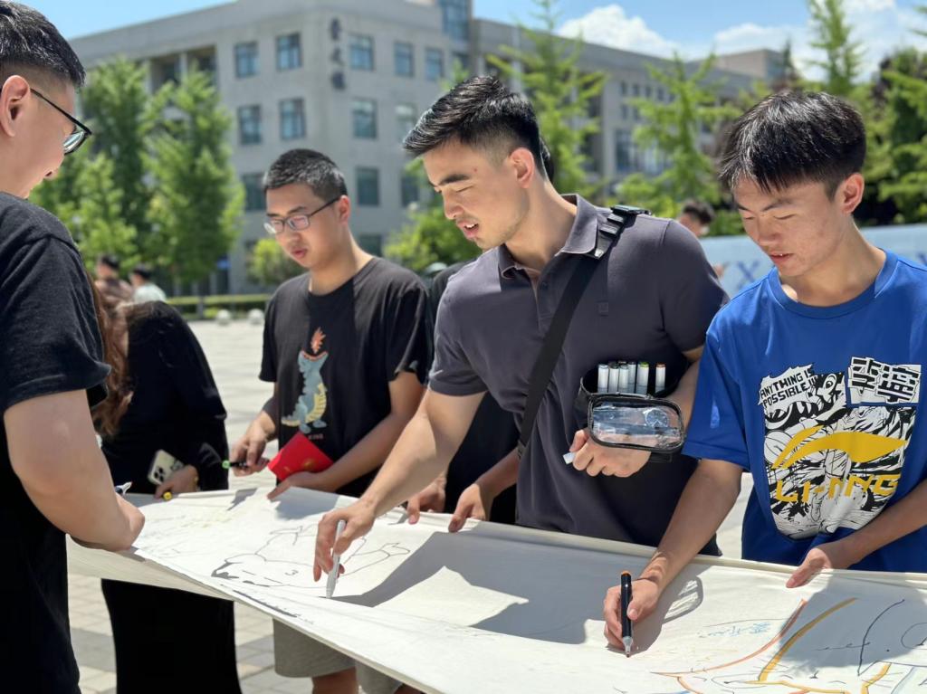 “輝煌明天長(zhǎng)卷拓印”主題活動(dòng)分別在鄠邑校區(qū)東區(qū)田徑場(chǎng)和圖書(shū)館南廣場(chǎng)展開(kāi)。在田徑場(chǎng)上,長(zhǎng)長(zhǎng)的畫(huà)卷兩旁圍滿了熟悉的畢業(yè)生身影,大家用自己天馬行空的想象,或一人,或三三兩兩盡情地點(diǎn)墨揮毫、涂抹揮灑,表達(dá)離別之意。“山高水長(zhǎng),一路壯歌,看我輝煌明天”,長(zhǎng)卷上的這行文字閃耀著同學(xué)們大學(xué)四年的青春,洋溢著曾經(jīng)的點(diǎn)點(diǎn)滴滴,此事此刻,仿佛《輝煌明天》歌聲響起,大學(xué)生活在這一刻重現(xiàn),未來(lái)的日子在這一刻瞬間展望?,F(xiàn)場(chǎng)除了畢業(yè)生,也有在校生為即將離別的學(xué)長(zhǎng)學(xué)姐送來(lái)祝福,大家聚集在一起,用不同的繪畫(huà)方式進(jìn)行創(chuàng)作,同學(xué)們用歌聲,用歡笑,用心語(yǔ),用自己的方式為未來(lái)的自己送上最美好的期許,為即將分別的母校送上最深厚的祝福。經(jīng)過(guò)數(shù)日的精心創(chuàng)作與準(zhǔn)備,6月14日中午,“輝煌明天長(zhǎng)卷拓印”主題活動(dòng)終于在鄠邑校區(qū)圖書(shū)館南廣場(chǎng)迎來(lái)了其收官之作,當(dāng)一條長(zhǎng)達(dá)50余米的長(zhǎng)卷鋪展開(kāi)來(lái),宛如一條歷史的長(zhǎng)河,見(jiàn)證著學(xué)校的發(fā)展歷程和畢業(yè)生們的成長(zhǎng)足跡。活動(dòng)現(xiàn)場(chǎng)吸引了近千名師生踴躍參與、駐足觀賞,現(xiàn)場(chǎng)師生用自己的畫(huà)筆和色彩,在長(zhǎng)卷上描繪出一幅幅充滿創(chuàng)意和希望的畫(huà)面,繪制現(xiàn)場(chǎng)熱鬧非凡,大家沉浸其中,充分施展才華,為長(zhǎng)卷畫(huà)龍點(diǎn)睛、錦上添花,共同展開(kāi)創(chuàng)作這幅波瀾壯闊的巨幅畫(huà)卷。長(zhǎng)卷中各具特色的創(chuàng)作形式,出自師生們的奇思妙想和獨(dú)特創(chuàng)意,表達(dá)了畢業(yè)生對(duì)母校的不舍與感激,體現(xiàn)了老師們對(duì)學(xué)子最真摯的祝福與鼓勵(lì)。當(dāng)這條承載著畢業(yè)生們情感和回憶的長(zhǎng)卷完成時(shí),現(xiàn)場(chǎng)響起了熱烈的掌聲和歡呼聲,畢業(yè)生們紛紛上前合影留念,將這份難忘的記憶永遠(yuǎn)定格在了這一刻。