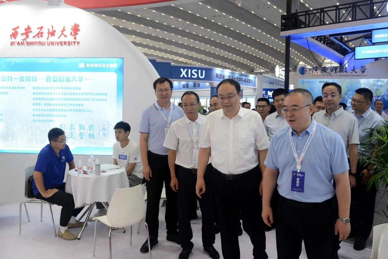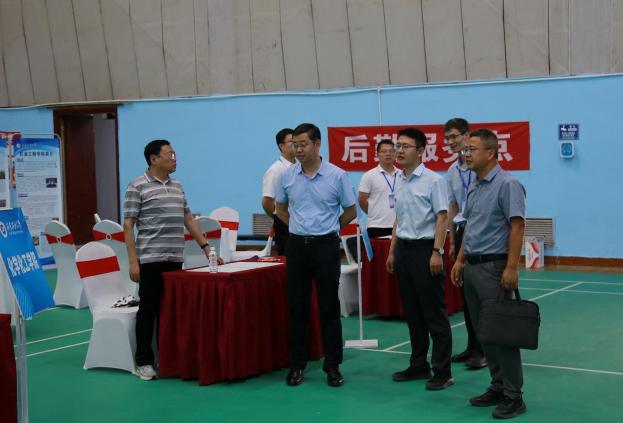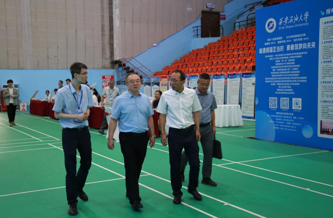 6月24日至26日,學(xué)校宣傳部、教務(wù)處、科研處、研究生院、馬克思主義學(xué)院以及各院(系)專家教授與招生志愿者共同參加第十二屆陜西教育博覽會暨招生咨詢會。學(xué)校展臺搭建以石油紅為主色調(diào),突出石油石化特色,中心位置石油樹象征石油噴薄如飛瀑涌泉,發(fā)展的動力源源不斷,精心陳列原油、巖心、礦物標本、連續(xù)油管作業(yè)車模型,展示學(xué)校流體動力式雙重聲波防蠟裝置等5項科技成果及研究生科技創(chuàng)新成果。省委教育工委副書記、教育廳廳長王樹聲在校領(lǐng)導(dǎo)常江、張君濤的陪同下蒞臨我校展位視察工作。