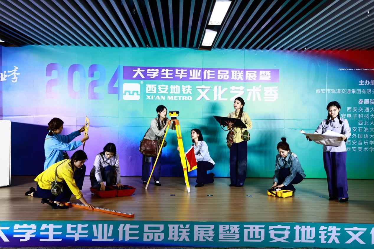 在大學(xué)生畢業(yè)作品展區(qū),由西安交通大學(xué)、西安電子科技大學(xué)、西北大學(xué)、西安石油大學(xué)、西安外國(guó)語(yǔ)大學(xué)、西安美術(shù)學(xué)院、西安音樂(lè)學(xué)院等高校設(shè)計(jì)的140余件(組)優(yōu)秀畢業(yè)作品也在車(chē)站同步展出。其中,既包括實(shí)體的繪畫(huà)作品、雕塑作品、文創(chuàng)作品、文藝展演,也有數(shù)字藝術(shù)、機(jī)器人、無(wú)人機(jī)通信技術(shù)等科技作品。大學(xué)生們的優(yōu)秀作品先后在地鐵西安站、行政中心站、鐘樓站三個(gè)車(chē)站驚艷亮相。