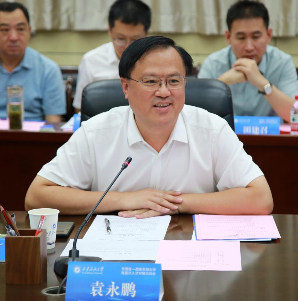 張木在致辭中向袁永鵬一行到訪學(xué)校開(kāi)展對(duì)接洽談和合作交流表示熱烈歡迎,對(duì)東營(yíng)市、東營(yíng)區(qū)、勝利油田和各位企業(yè)家長(zhǎng)期以來(lái)給予學(xué)校的大力支持和幫助表示感謝。他簡(jiǎn)要回顧了學(xué)校70余年的發(fā)展歷程和辦學(xué)成就,并介紹了第三次黨代會(huì)提出的宏偉發(fā)展藍(lán)圖和今年已完成的“三個(gè)小目標(biāo)”。他指出,學(xué)校多年來(lái)始終堅(jiān)持石油精神辦學(xué),鐵人精神育人,延安精神鑄魂,培養(yǎng)的學(xué)生在各自的工作崗位和研究領(lǐng)域都取得了驕人的成績(jī),很好地彰顯了學(xué)?!八膶?shí)一新”的人才培養(yǎng)特色,為母校贏得了良好聲譽(yù)。他表示,近幾年勝利油田、東營(yíng)市及轄區(qū)的多個(gè)部門(mén)和企業(yè)多次來(lái)校開(kāi)展技術(shù)交流和人才合作,也取得了豐碩的合作成果。他強(qiáng)調(diào),以此次活動(dòng)為新起點(diǎn),雙方建立高效的信息溝通機(jī)制、工作對(duì)接機(jī)制,把會(huì)談的內(nèi)容和協(xié)議確定的合作事項(xiàng),形成意向書(shū)和任務(wù)清單并加快落實(shí)落地,盡早取得更大實(shí)效,共同探討合作的新模式、新路徑,為東營(yíng)的高質(zhì)量發(fā)展提供西石大強(qiáng)有力的技術(shù)和人才支撐。