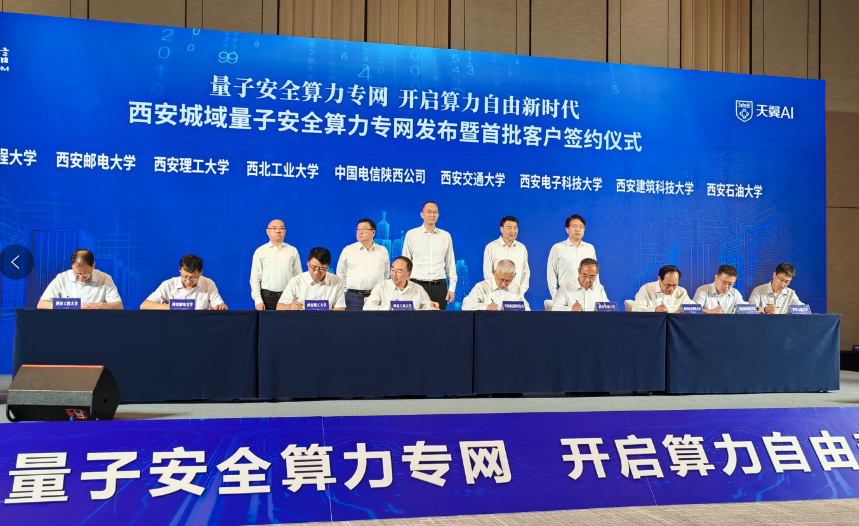 9月19日上午,中國電信全國首個城域量子安全算力專網(wǎng)發(fā)布會暨首批客戶簽約儀式在西安舉辦,本次會議的主題是“量子安全算力專網(wǎng)、開啟算力自由新時代”。西安市人大常委會副主任李寧君,中國電信集團有限公司黨組成員、副總經(jīng)理李峻,陜西電信黨委書記、總經(jīng)理上官亞非,陜西電信黨委副書記、副總經(jīng)理王磊及相關企業(yè)代表出席會議。我校校長王進富、副校長蘇文甫應邀參加會議。