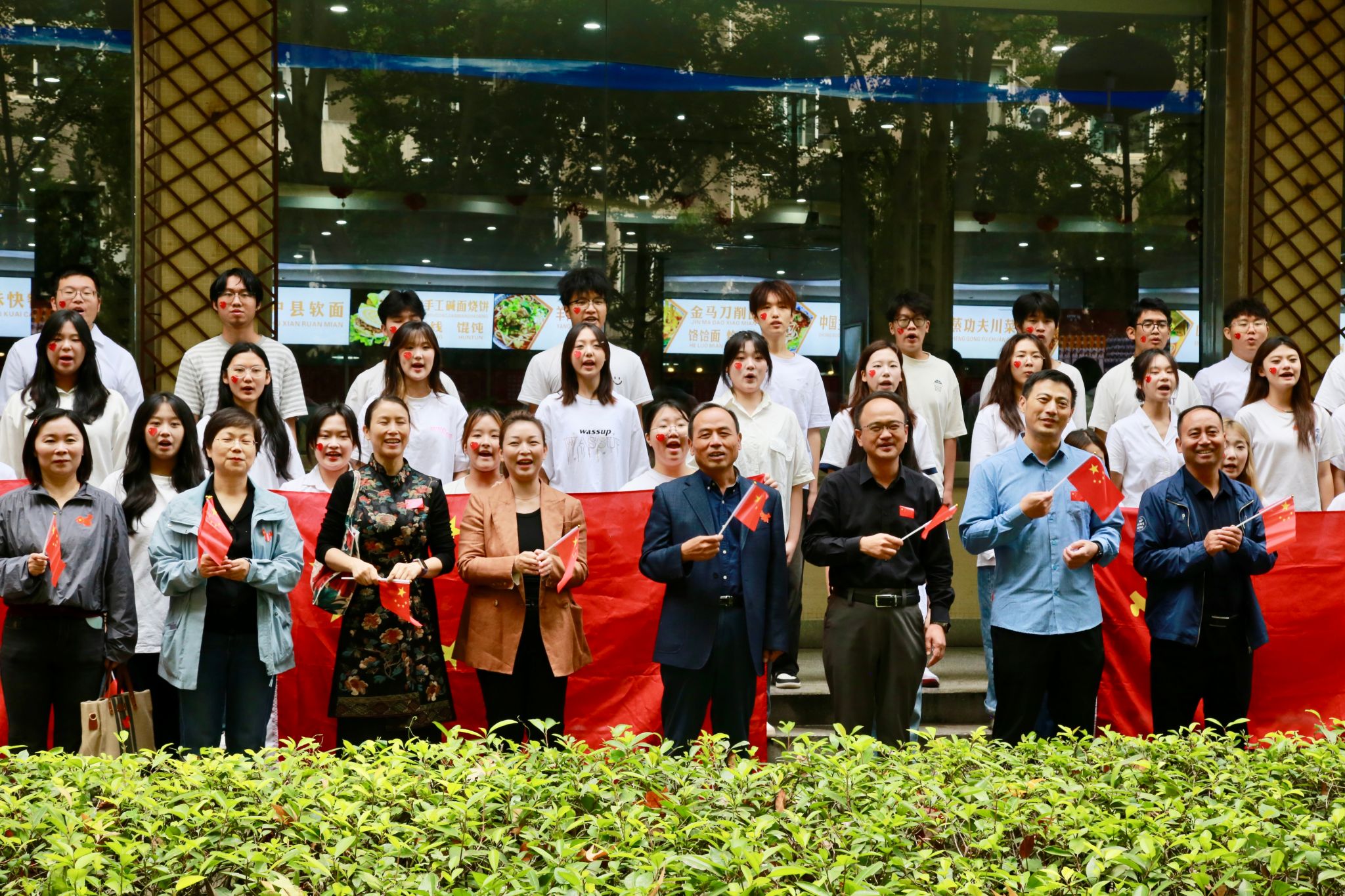 中午12點(diǎn),參加快閃活動的學(xué)生在學(xué)校學(xué)生餐廳門前集合,活動在朱玥、馮洋洋兩位老師領(lǐng)唱的歌曲《五星紅旗》中拉開序幕?!拔逍羌t旗啊五星紅旗,你將中華民族的心連在了一起。五星紅旗啊五星紅旗,你讓全世界中國人揚(yáng)眉吐氣?!备S著歌詞,在場師生紛紛舉起手中的五星紅旗,跟著節(jié)奏的律動揮舞,表達(dá)著對祖國的無限敬仰與熱愛。