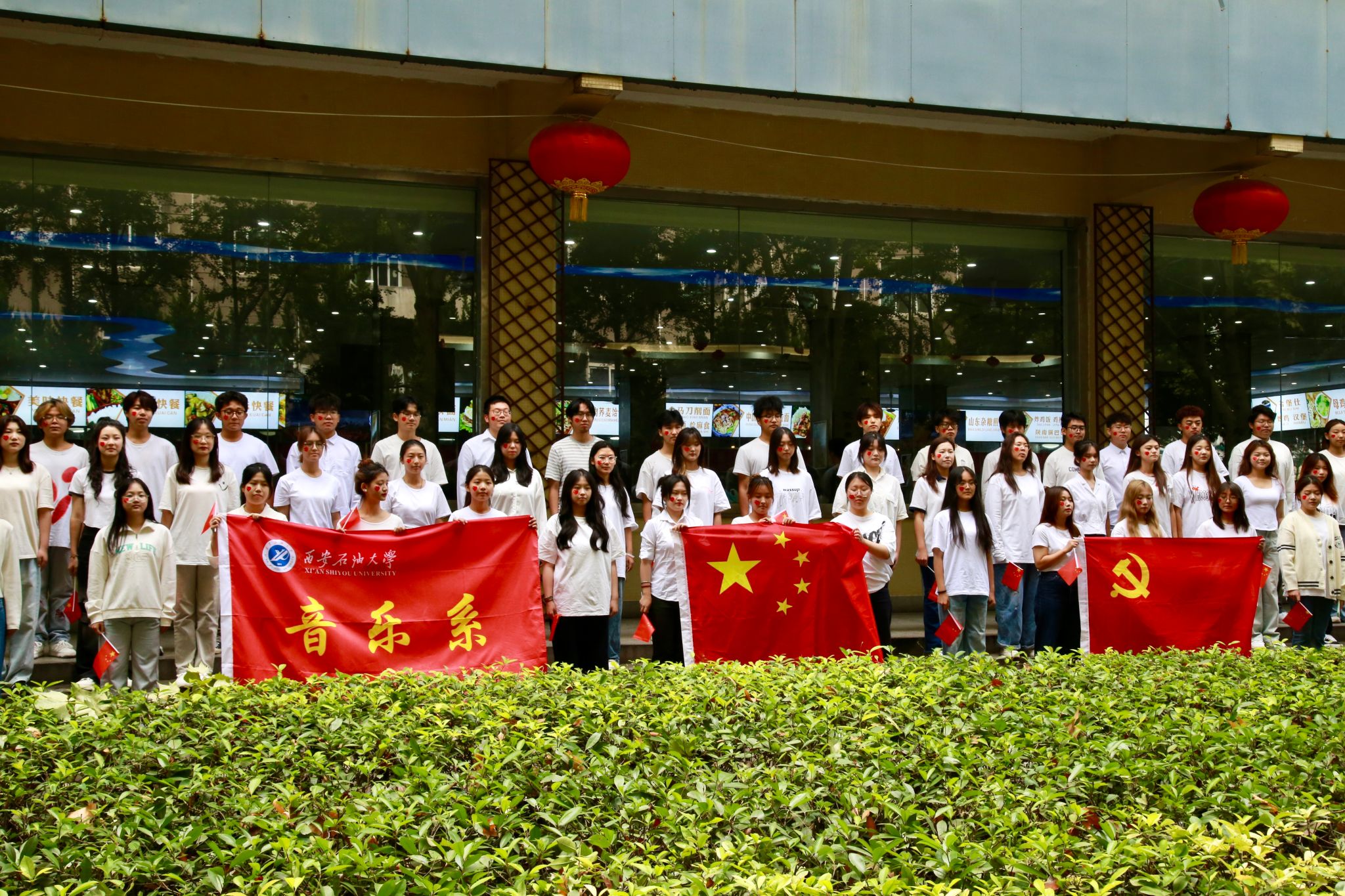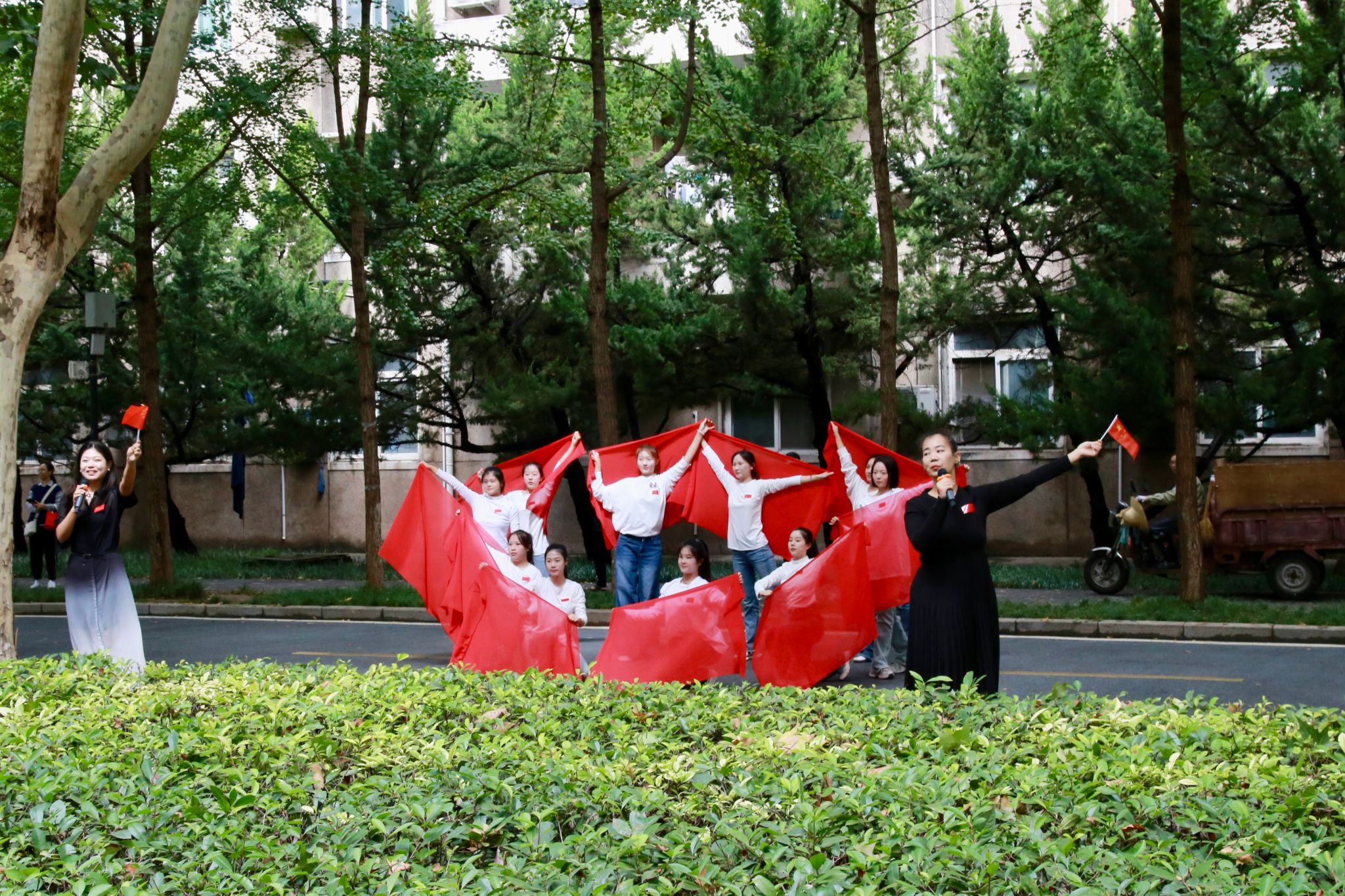 為慶祝中華人民共和國成立75周年,激發(fā)廣大師生的愛國情懷,展現(xiàn)新時代青年的朝氣蓬勃與愛國主義熱情,9月30日中午12點(diǎn),由音樂系和宣傳部聯(lián)合舉辦的“紅歌快閃”活動在雁塔校區(qū)餐廳前成功舉辦。校黨委委員、副校長趙健,校黨委委員、宣傳部部長趙承勝,國有資產(chǎn)處處長候琦,以及90余名音樂系師生參加了本次“紅歌快閃”活動。該活動由音樂系黨總支策劃,聲樂教研室主任田立指導(dǎo),舞蹈教師何云老師編排,聲樂教師朱玥、馮洋洋領(lǐng)唱。