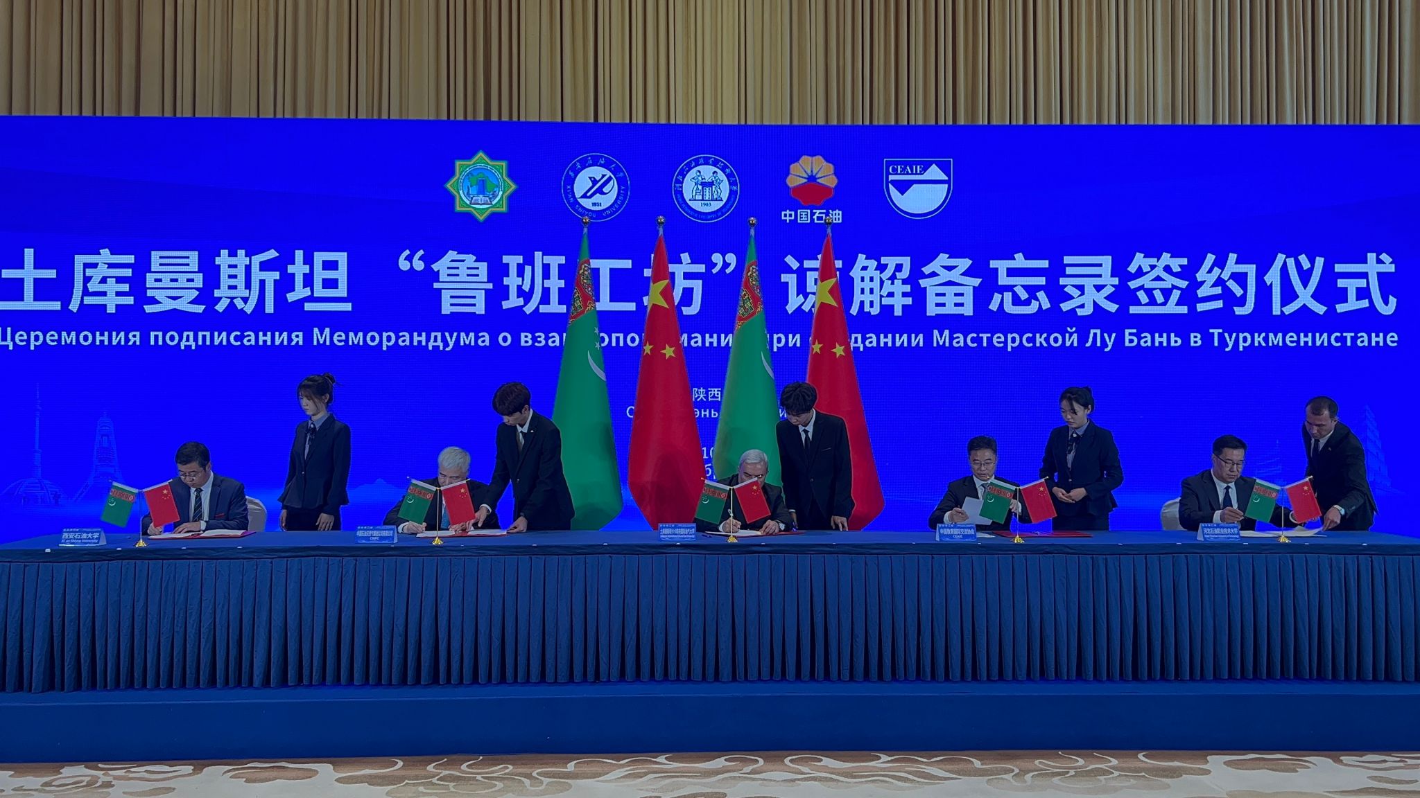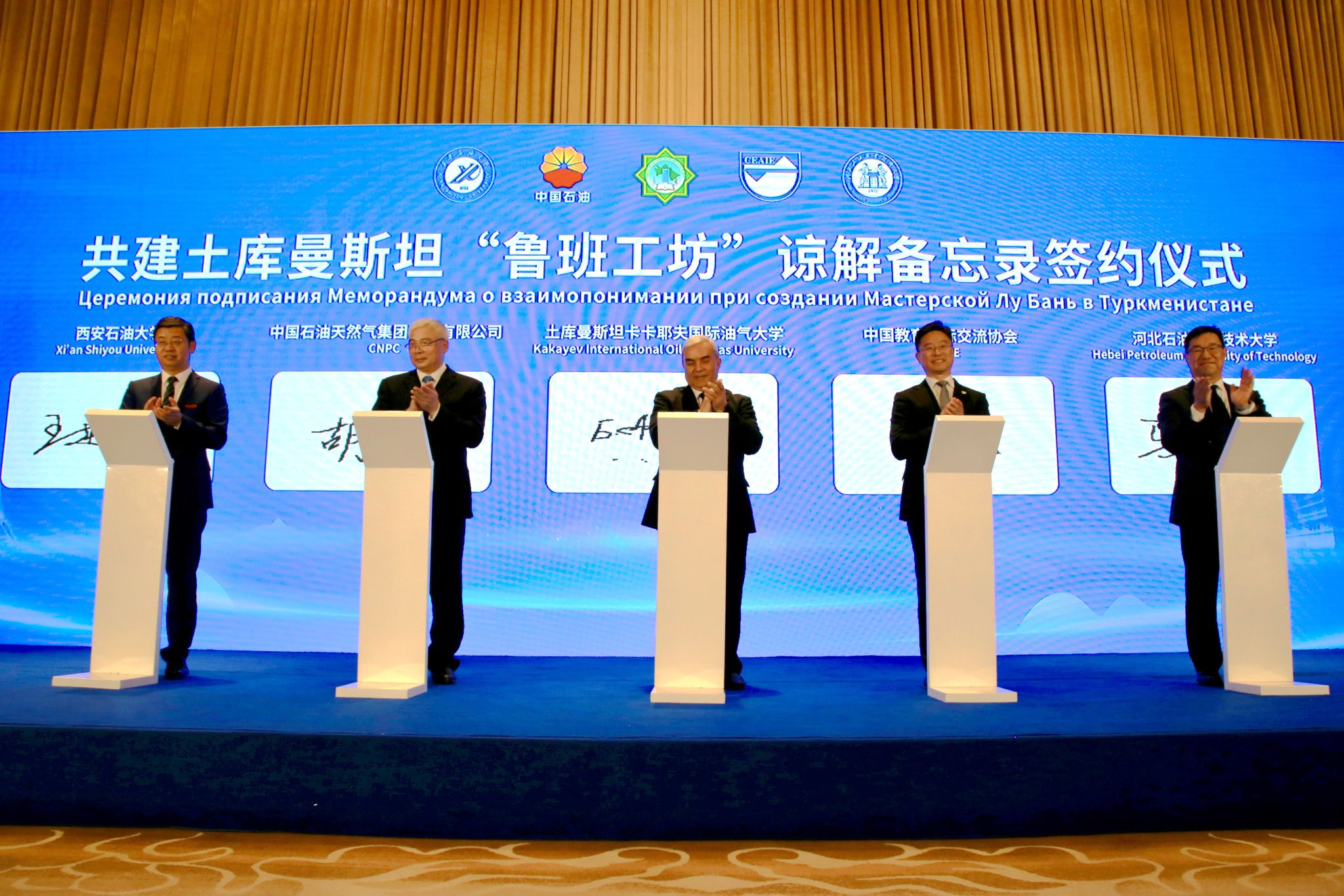 18日下午,共建土庫曼斯坦“魯班工坊”諒解備忘錄簽約儀式在陜西賓館成功舉行。土庫曼斯坦卡卡耶夫油氣大學(xué)校長拜拉姆穆拉特·阿塔馬諾夫、西安石油大學(xué)校長王進(jìn)富、河北石油職業(yè)技術(shù)大學(xué)副校長馬顯才、中國教育國際交流協(xié)會秘書長楊軍、中國石油天然氣集團(tuán)有限公司人力資源部副總經(jīng)理胡紅民分別代表中土共建各方共同簽署《土庫曼斯坦魯班工坊諒解備忘錄》。