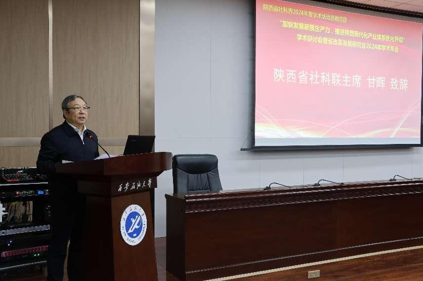 甘暉在致辭中,對(duì)本次研討會(huì)在西安石油大學(xué)的成功舉辦表示熱烈祝賀,并強(qiáng)調(diào)研究會(huì)始終堅(jiān)持以習(xí)近平新時(shí)代中國(guó)特色社會(huì)主義思想為指導(dǎo),緊密?chē)@省委省政府的中心工作,聚焦改革發(fā)展中的重大理論和實(shí)踐問(wèn)題,取得了顯著成果,為政府部門(mén)制定政策、企業(yè)謀劃發(fā)展提供了有益借鑒。他期望專(zhuān)家們能深入討論,為陜西的發(fā)展獻(xiàn)計(jì)獻(xiàn)策,并介紹了社科聯(lián)對(duì)學(xué)術(shù)活動(dòng)的支持,希望研究會(huì)繼續(xù)發(fā)揮其優(yōu)勢(shì),推動(dòng)更多優(yōu)秀成果的轉(zhuǎn)化應(yīng)用。