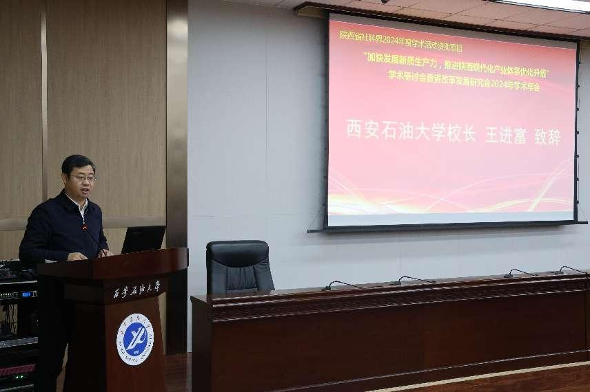 王進(jìn)富在致辭中向與會(huì)的專(zhuān)家學(xué)者表達(dá)了熱烈的歡迎和衷心的感謝,并向長(zhǎng)期以來(lái)關(guān)心和支持學(xué)校建設(shè)與發(fā)展的各方人士表示了崇高的敬意。他詳細(xì)介紹了學(xué)校的歷史沿革,指出西安石油大學(xué)是由老一輩革命家創(chuàng)立的,擁有豐富的學(xué)術(shù)傳統(tǒng)和鮮明的學(xué)科特色。在面對(duì)全球快速變化和科技革新的背景下,王進(jìn)富強(qiáng)調(diào)了發(fā)展新生產(chǎn)力的重要性以及教育工作者和科研人員肩負(fù)的責(zé)任。他還分享了學(xué)校在學(xué)科建設(shè)、科研成就以及產(chǎn)學(xué)研合作方面的進(jìn)展,并強(qiáng)調(diào)了對(duì)社會(huì)科學(xué)研究的重視,以及與陜西省改革發(fā)展研究會(huì)的緊密合作關(guān)系。