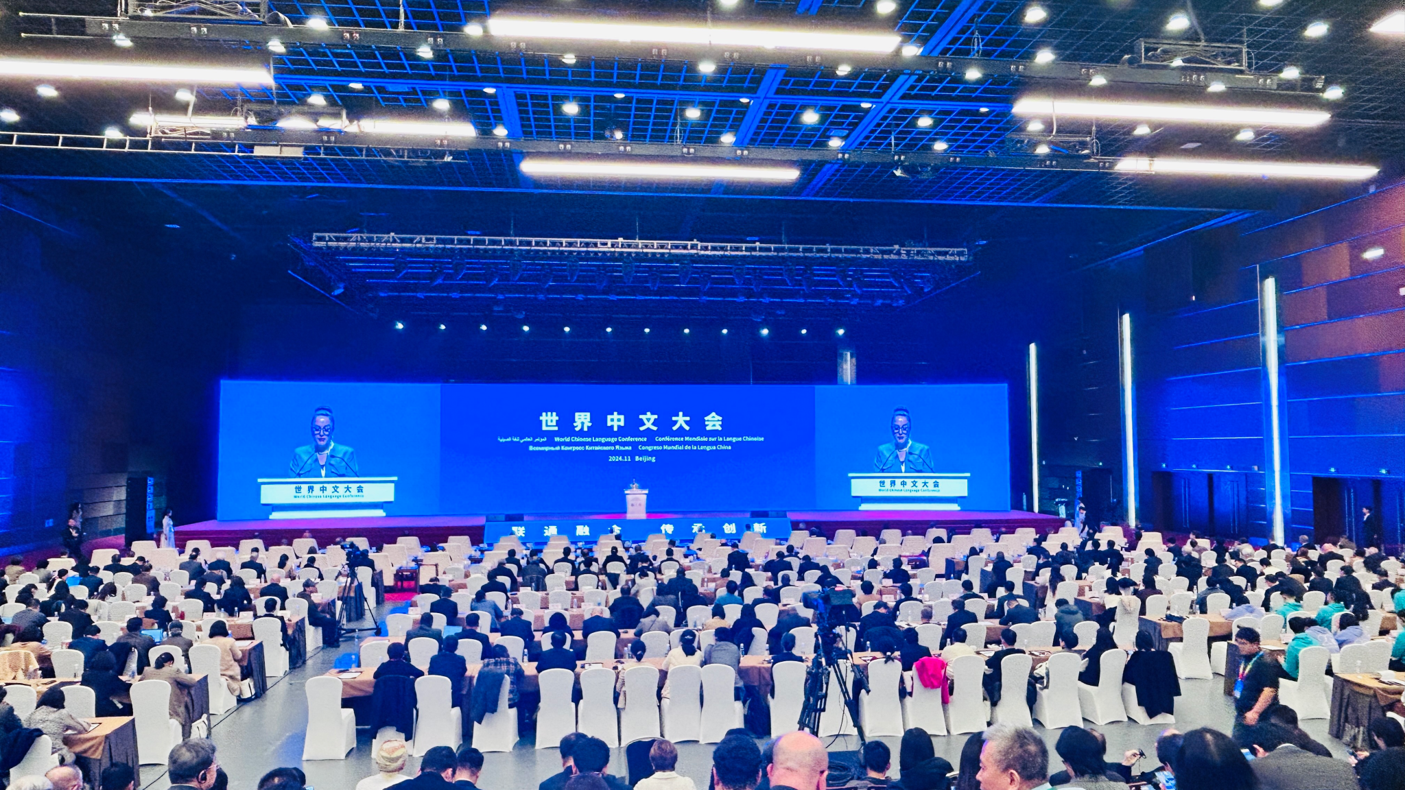 2024世界中文大會由中國教育部主辦,主題為“聯(lián)通融合 傳承創(chuàng)新”,白俄羅斯中國友好協(xié)會主席、前副總理托濟(jì)克,柬埔寨副首相兼教育、青年和體育部部長韓春納洛等中外代表在大會上發(fā)言。來自160余個國家和地區(qū)的2000多名政府官員、校長、專家學(xué)者、師生代表和駐華使節(jié)等出席會議。