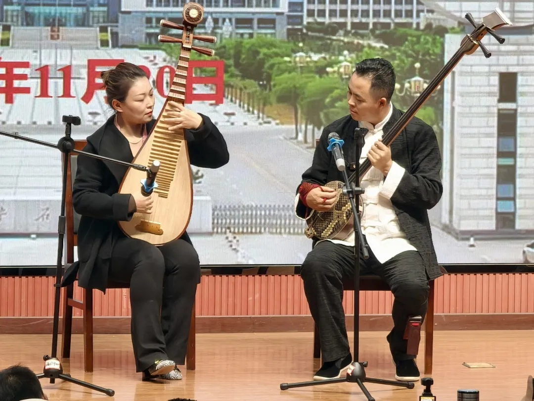 在報(bào)告環(huán)節(jié),音樂系副主任張帆作為主講,從陜北說書的起源傳說、藝術(shù)特征、代表書匠、重要節(jié)點(diǎn)、機(jī)遇挑戰(zhàn)等五個(gè)方面作了專題背景介紹,并與熊竹英聯(lián)袂演奏了《南泥灣》。