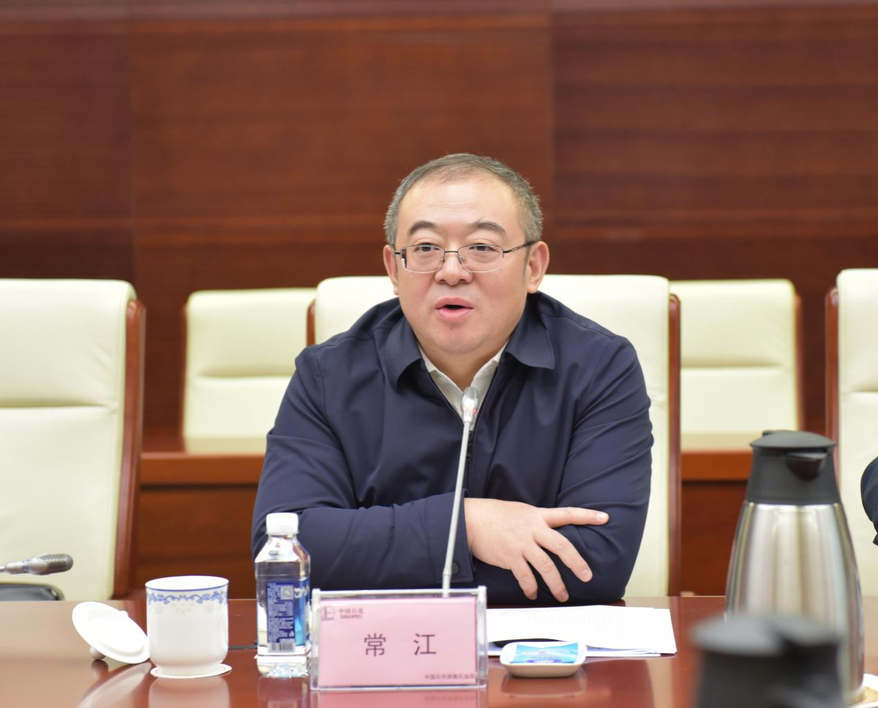在中國(guó)石化勘探分公司走訪交流期間,公司總經(jīng)理、黨委副書(shū)記王國(guó)力、黨委副書(shū)記、紀(jì)委書(shū)記、工會(huì)主席馮景戰(zhàn)等企業(yè)領(lǐng)導(dǎo)出席座談交流。王國(guó)力對(duì)學(xué)校的辦學(xué)歷史表達(dá)了深厚的敬意,對(duì)學(xué)??蒲谐晒⒆黠L(fēng)建設(shè)及未來(lái)發(fā)展規(guī)劃等給予了高度贊賞,他表示,當(dāng)前是國(guó)家能源事業(yè)發(fā)展的重要時(shí)期,也是雙方合作迎來(lái)新機(jī)遇的關(guān)鍵時(shí)期,希望雙方能夠保持常來(lái)常往的緊密聯(lián)系,齊心協(xié)力,共同應(yīng)對(duì)挑戰(zhàn),把握機(jī)遇,為國(guó)家能源事業(yè)的繁榮與發(fā)展書(shū)寫(xiě)新的篇章。
