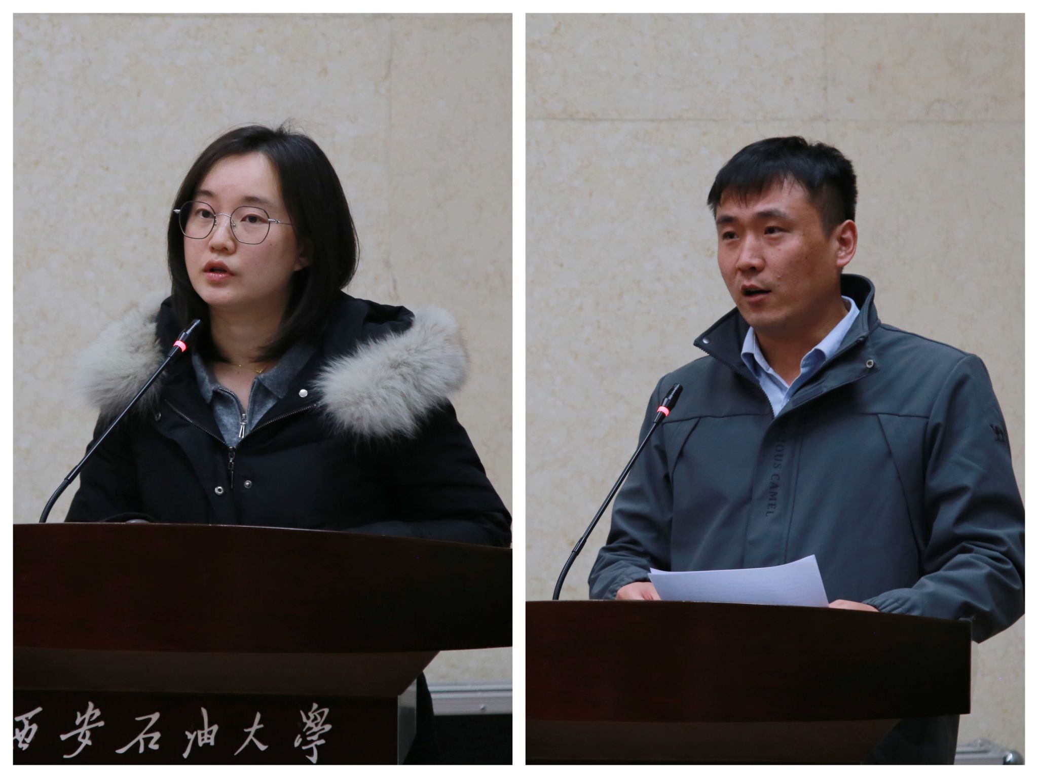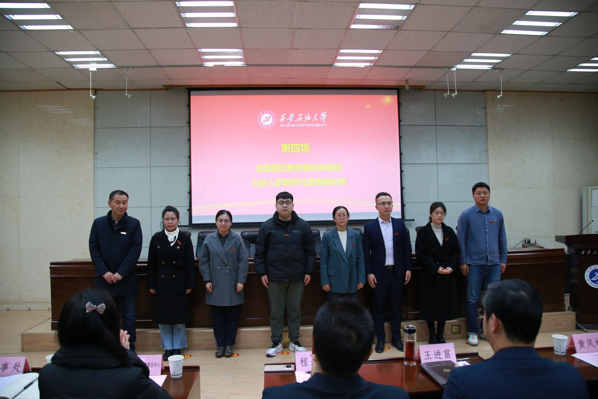 黃風(fēng)林教授為新入職教師代表佩戴?;眨瑐鬟f出一份深深的囑托,也象征著教育精神的薪火相傳。青年教師代表、石油工程學(xué)院副教授劉婭菲分享了個(gè)人角色轉(zhuǎn)換、職業(yè)發(fā)展和教學(xué)科研工作等方面心路歷程;新入職教師代表、地球科學(xué)與工程學(xué)院喬建偉老師在交流發(fā)言中表達(dá)了為建設(shè)高水平教學(xué)研究型大學(xué)做貢獻(xiàn)的決心和信心。