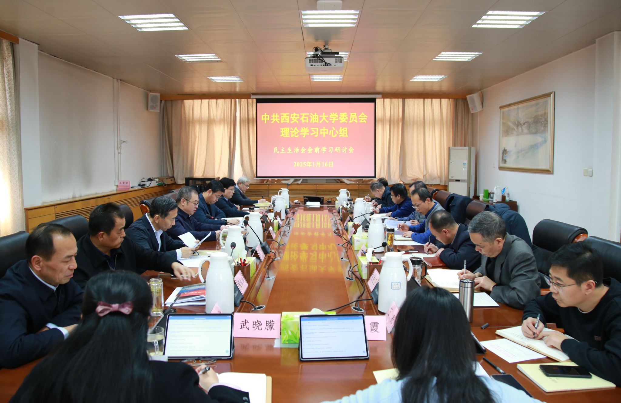 為切實(shí)打牢開好2024年度民主生活會的思想基礎(chǔ),進(jìn)一步提高政治站位、深化思想認(rèn)識、強(qiáng)化政治擔(dān)當(dāng),按照上級部署要求和學(xué)校黨委工作安排,1月16日下午,校黨委理論學(xué)習(xí)中心組2025年第1次學(xué)習(xí)會暨民主生活會會前學(xué)習(xí)研討會在雁塔校區(qū)行政樓五樓會議室召開,分集中學(xué)習(xí)和集體研討兩個環(huán)節(jié)進(jìn)行。校黨委書記常江主持并講話,校黨委理論學(xué)習(xí)中心組成員參加會議。