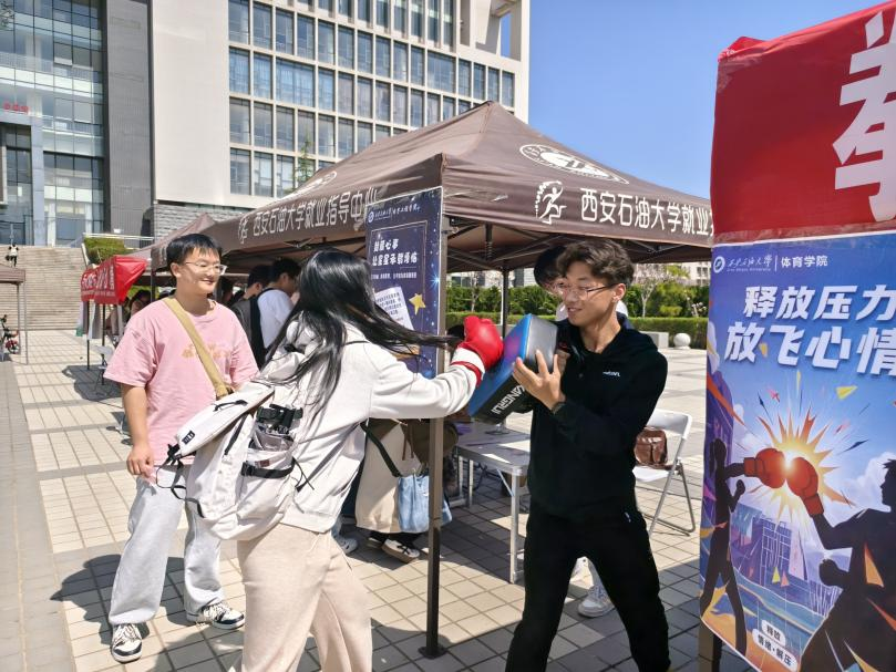 “以體強(qiáng)心”展臺(tái)上,體育學(xué)院的“釋放壓力、放飛心情”,通過擊打拳靶,促進(jìn)全身血液循環(huán),刺激多巴胺分泌,幫助同學(xué)們釋放壓力。