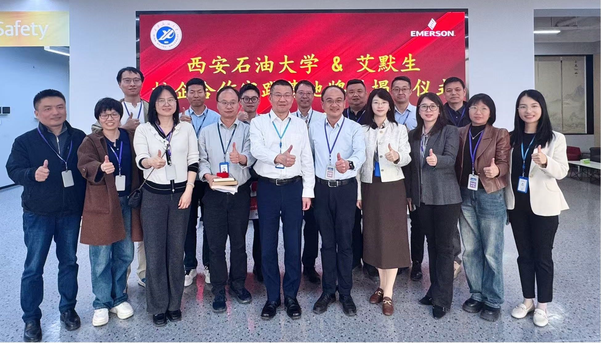座談結(jié)束后,趙健與郭勇移步至成果展示廳,在雙方團(tuán)隊(duì)見證下,共同為西安石油大學(xué)&艾默生公司"大學(xué)生校外實(shí)踐基地"牌匾揭幕。