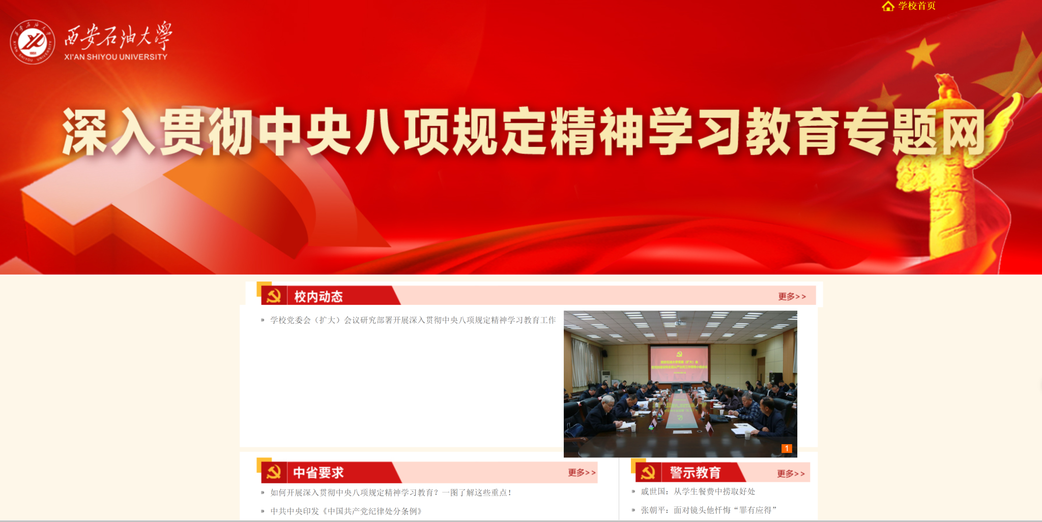 4月3日,“深入貫徹中央八項規(guī)定精神學習教育專題網(wǎng)站”開通上線。點擊學校主頁“深入貫徹中央八項規(guī)定精神學習教育”大圖,即可進入專題網(wǎng)站。