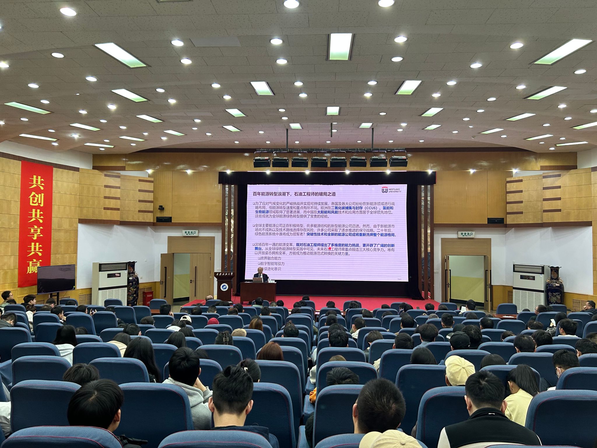 來訪期間,楊濤院士為學(xué)校師生作了題為《能源數(shù)字化和CCUS工業(yè)擴(kuò)展》的學(xué)術(shù)報告,詳細(xì)介紹了自動化鉆井、智能油田管理和遠(yuǎn)程操作、二氧化碳捕集與封存等能源行業(yè)前沿技術(shù),指出數(shù)字技術(shù)已成為推動能源行業(yè)綠色發(fā)展的核心動力,石油高校要主動應(yīng)變、積極求變,著力培養(yǎng)具有跨界融合能力、數(shù)字智能駕馭力、持續(xù)進(jìn)化能力的高層次人才,推動能源行業(yè)實現(xiàn)綠色低碳和高質(zhì)量發(fā)展。報告會上,楊濤院士與師生進(jìn)行了深入交流和研討。