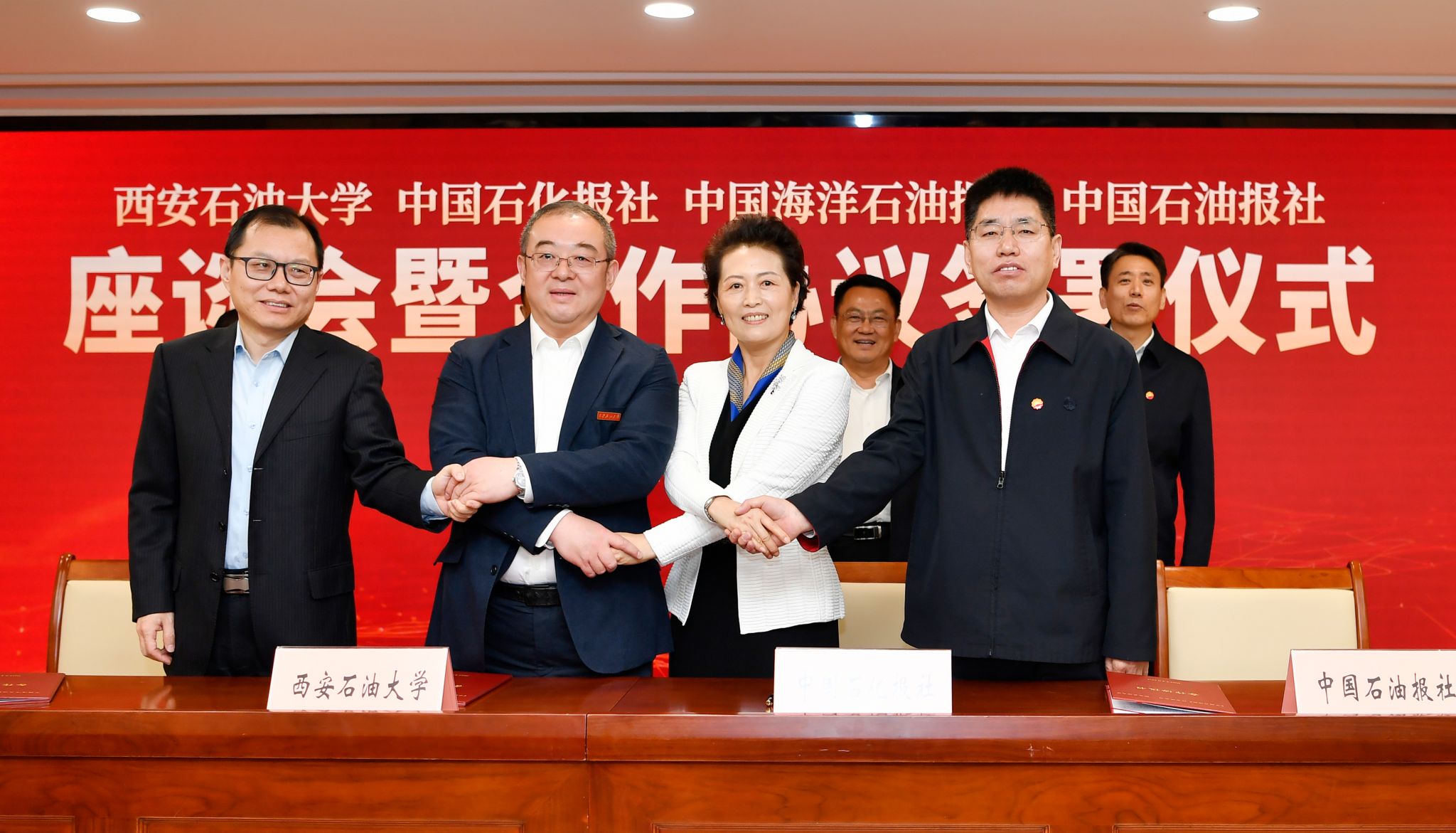 4月10日上午,西安石油大學與中國石油報、中國石化報、中國海洋石油報合作協(xié)議在京簽署。我校黨委書記常江,《中國石油報》社有限公司(中國石油融媒體中心)執(zhí)行董事、黨委書記霍恚明,中國石化報社社長、總編輯楊守娟,《中國海洋石油報》社有限公司副總經(jīng)理、總編輯劉洪波在與會嘉賓共同見證下,代表校媒四方簽署合作協(xié)議,共同譜寫新時代能源行業(yè)校媒合作發(fā)展的新篇章。簽約儀式由《中國石油報》社有限公司(中國石油融媒體中心)總經(jīng)理、黨委副書記耿玉鋒主持。