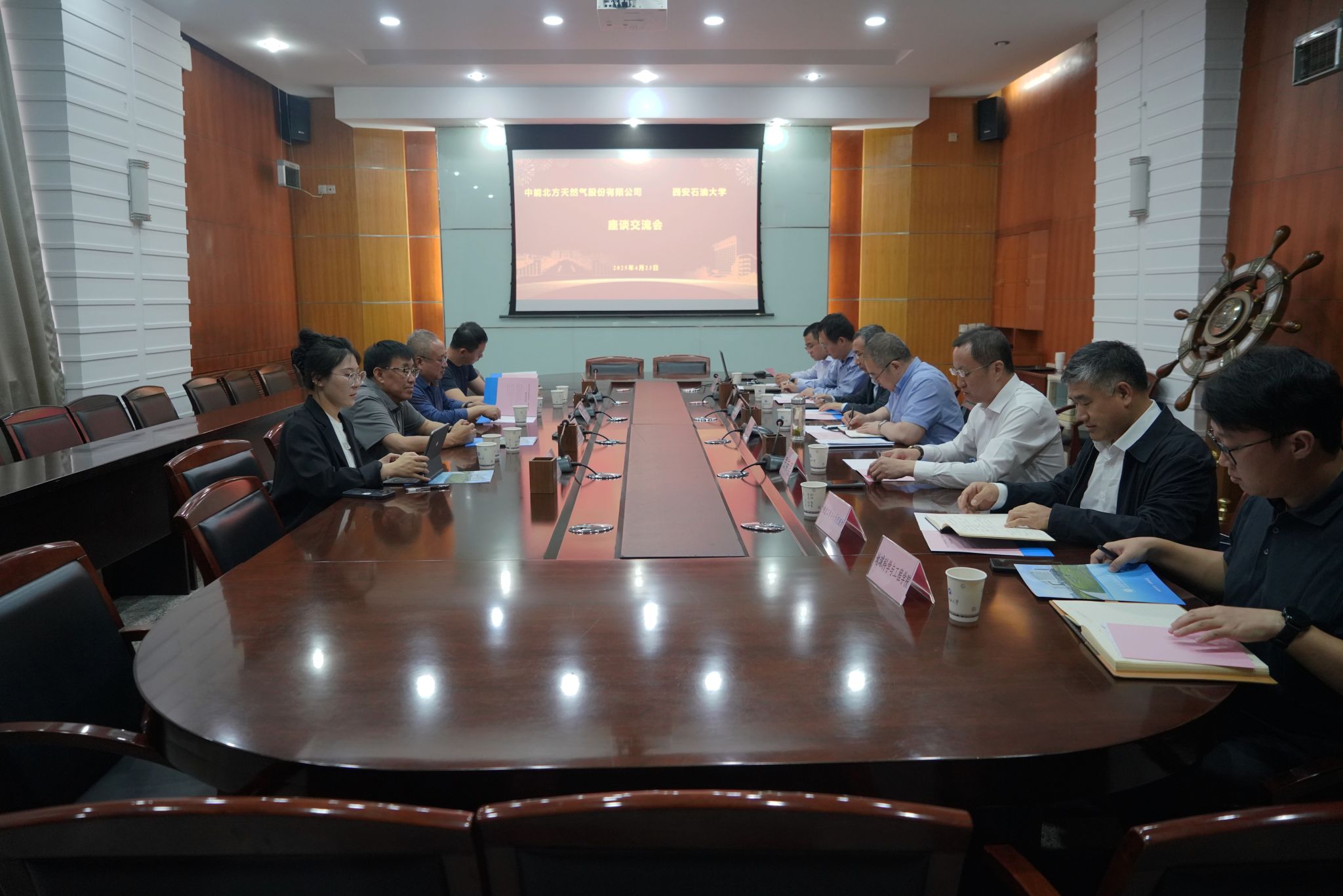 4月23日下午,中能北方天然氣股份有限公司(以下簡(jiǎn)稱“北氣集團(tuán)”)董事長(zhǎng)方長(zhǎng)青一行來(lái)校圍繞深化校企合作有關(guān)事宜座談交流。陜西省液化天然氣產(chǎn)業(yè)協(xié)會(huì)秘書(shū)長(zhǎng)艾紹軍陪同來(lái)訪。我校黨委書(shū)記常江、黨委副書(shū)記張木出席座談會(huì),會(huì)議由黨委委員、副校長(zhǎng)張榮軍主持。