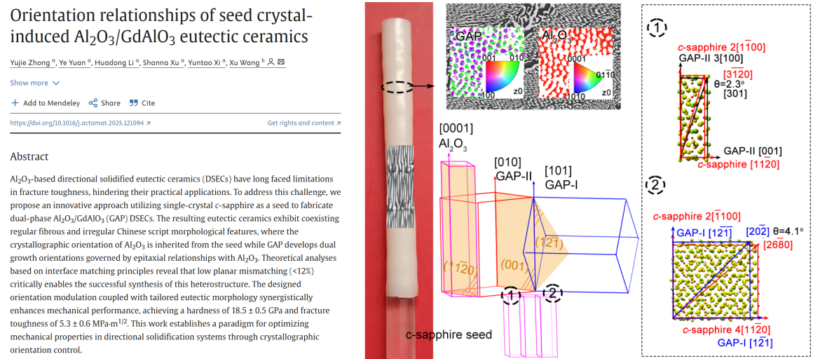 近日,我校材料科學(xué)與工程學(xué)院鐘玉潔科研團(tuán)隊再次以西安石油大學(xué)為第一單位,在材料頂級期刊《Acta Materialia》(中科院一區(qū)TOP期刊,五年影響因子9.3)上發(fā)表研究論文《Orientation relationships of seed crystal-induced Al2O3/GdAlO3 eutectic ceramics》。