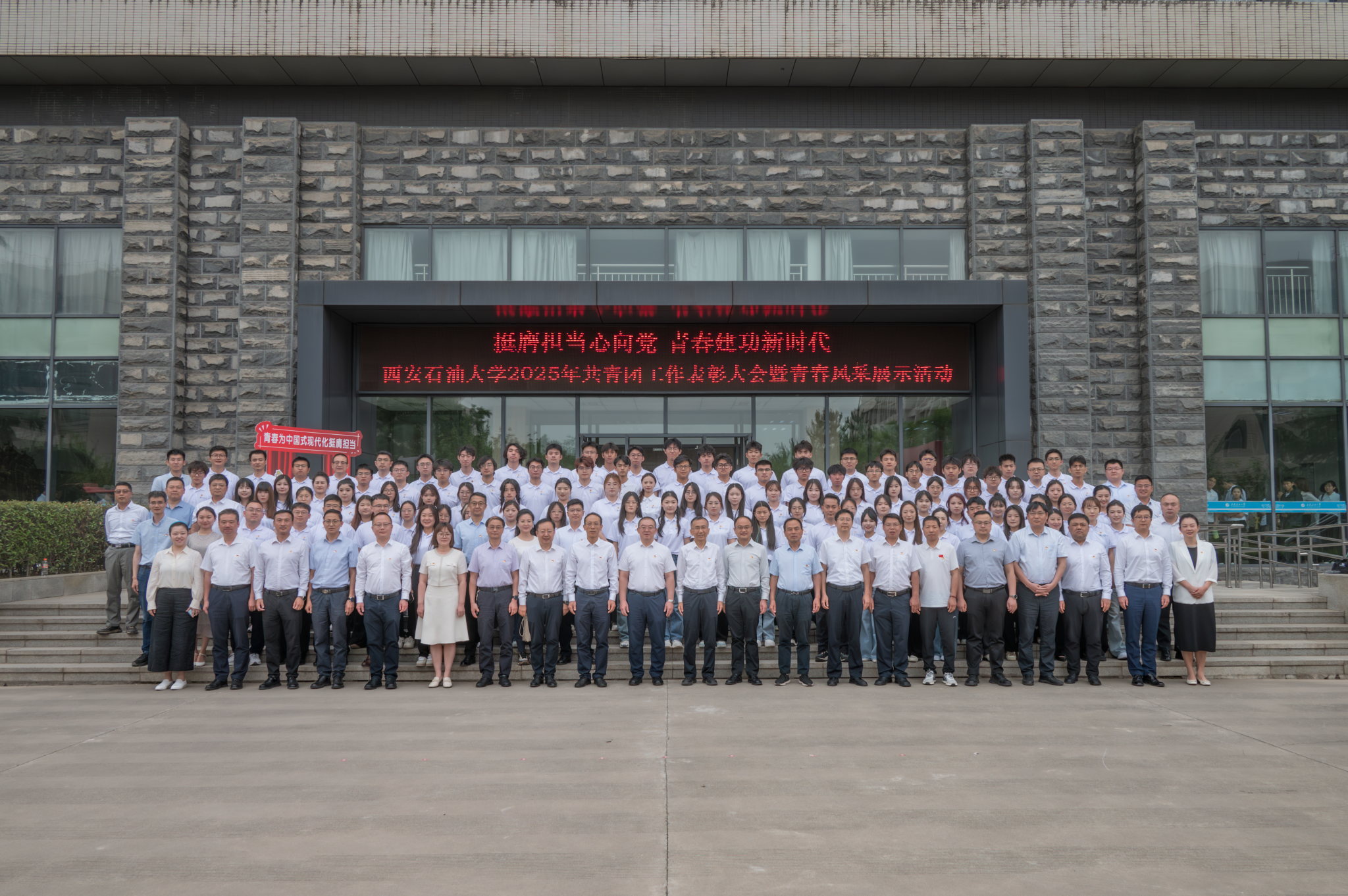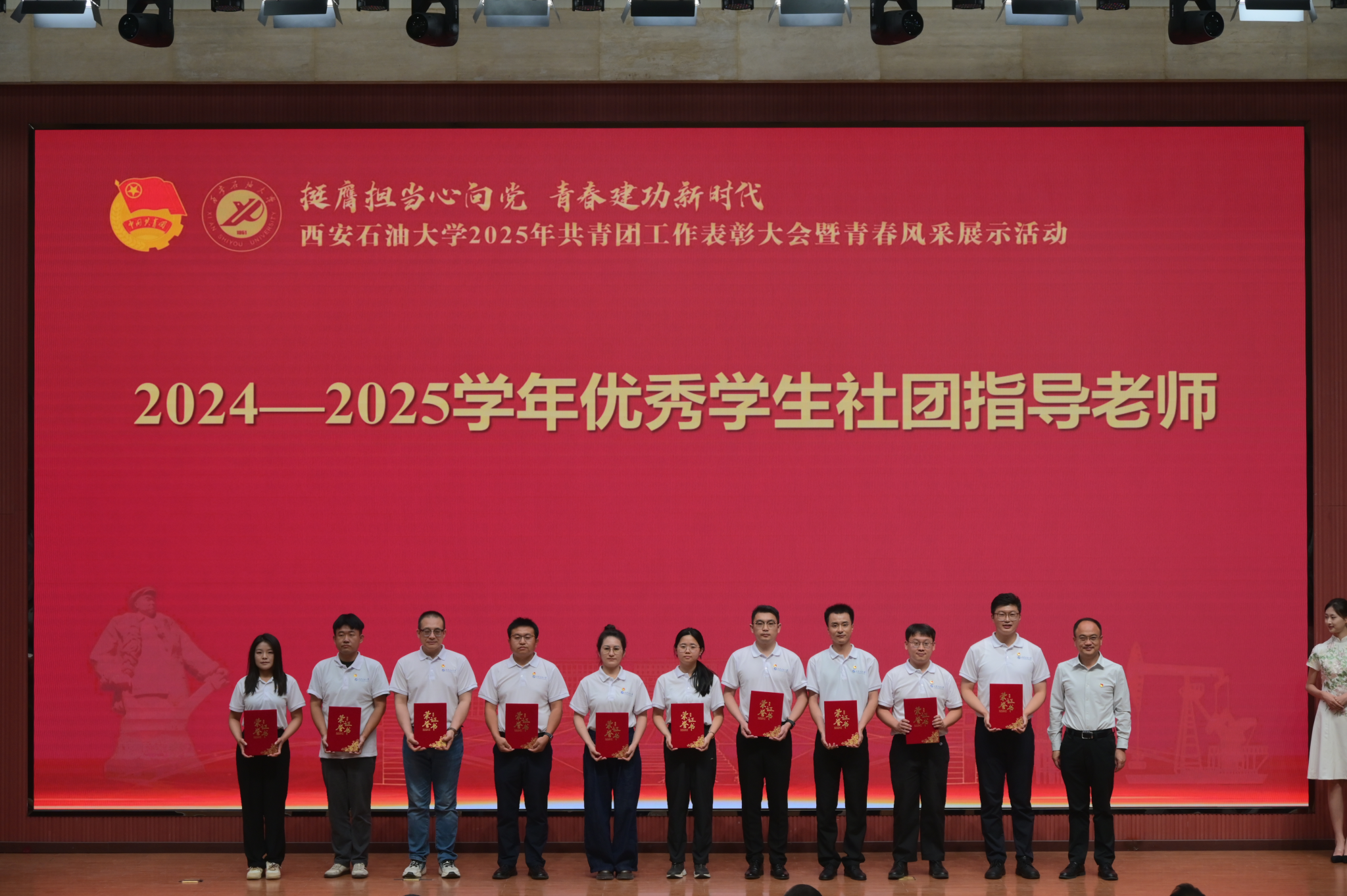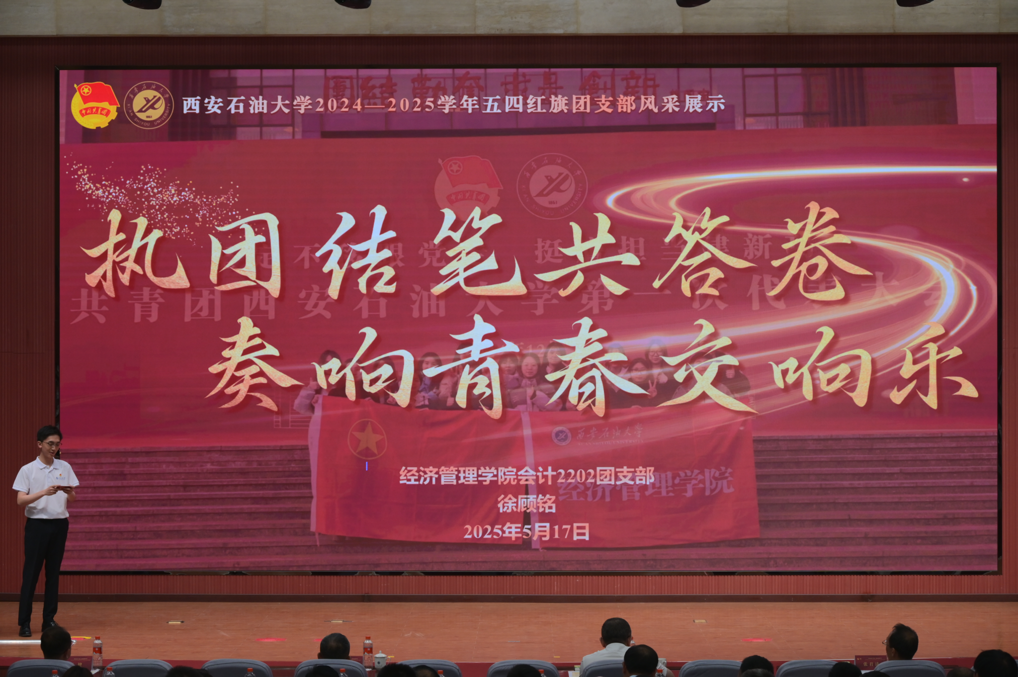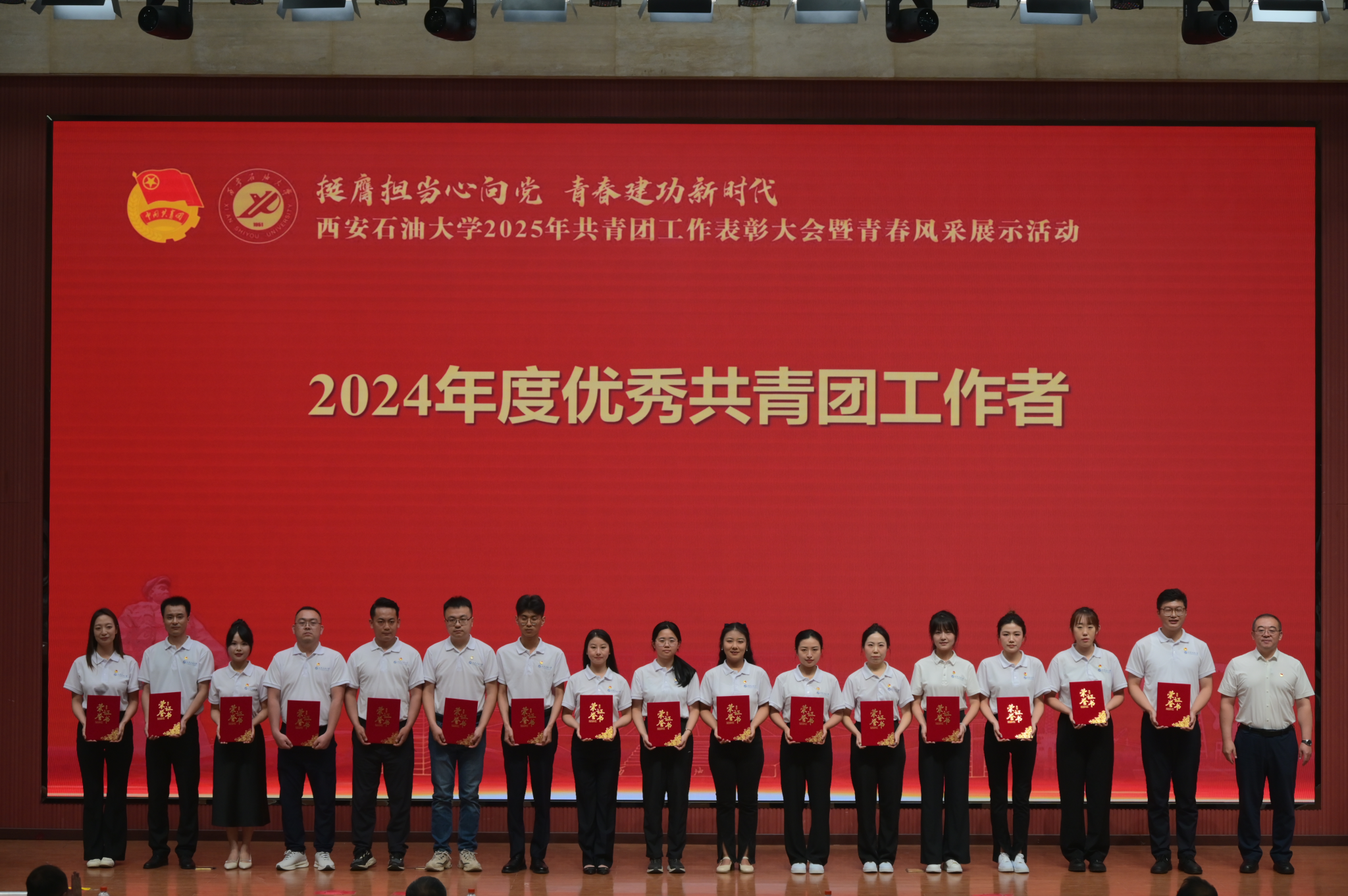 5月17日下午,“挺膺擔(dān)當(dāng)心向黨 青春建功新時(shí)代”西安石油大學(xué)2025年共青團(tuán)工作表彰大會暨青春風(fēng)采展示活動在鄠邑校區(qū)弘石學(xué)術(shù)報(bào)告廳舉行。校黨委書記常江、副書記張木,副校長張君濤、趙健,黨委辦公室(校長辦公室)、黨委組織部、黨委宣傳部、黨委學(xué)生工作部、黨委教師工作部、黨委保衛(wèi)部、教務(wù)處、研究生工作部、后勤處、馬克思主義學(xué)院負(fù)責(zé)人,各院(系)主管學(xué)生工作書記或副書記,全體輔導(dǎo)員,獲獎師生代表500余人參加大會。