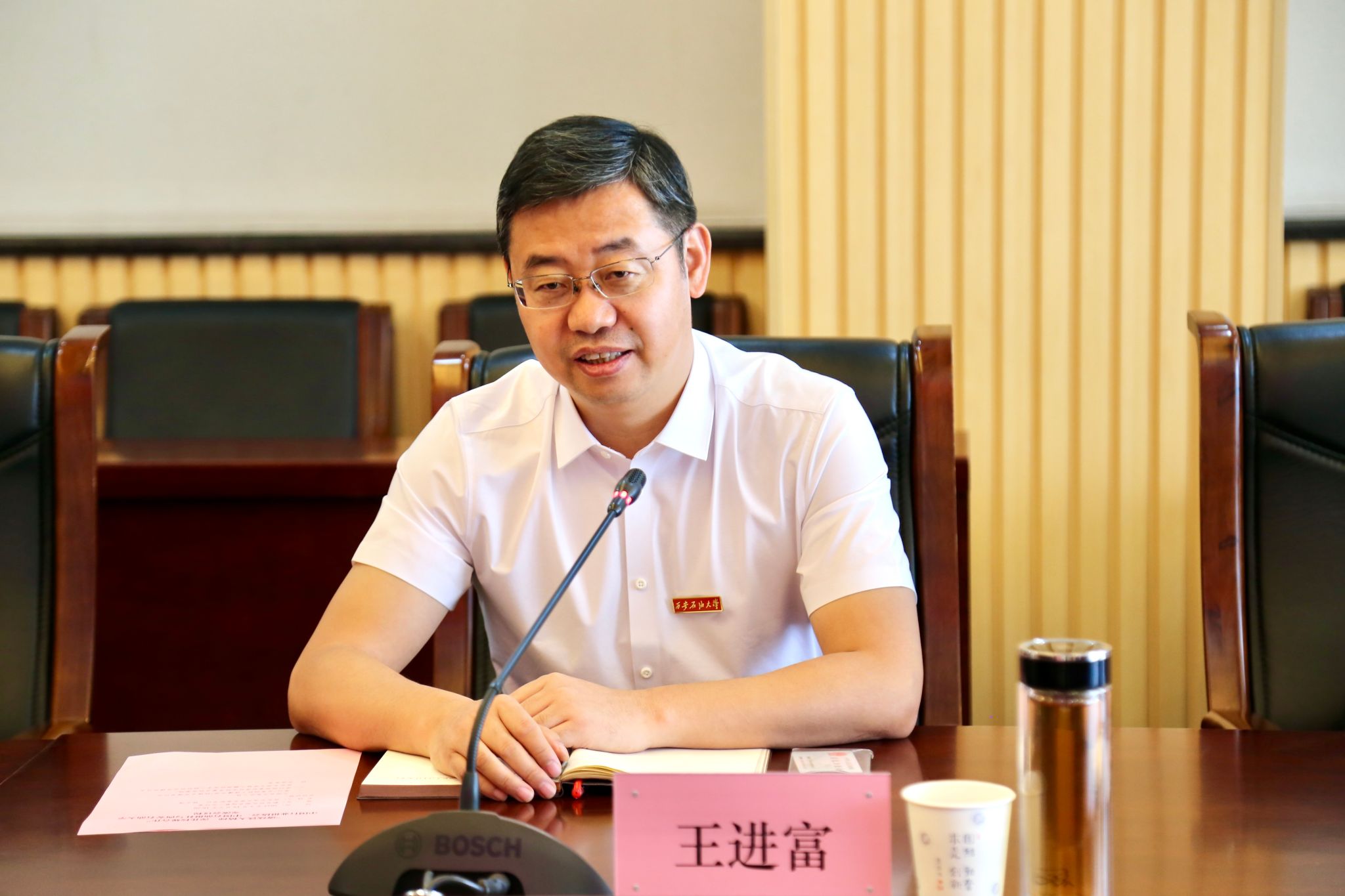王進(jìn)富對(duì)張超文、耿玉鋒一行的到訪表示熱烈歡迎,并介紹了學(xué)校在人才培養(yǎng)和校企合作方面的最新成果。他強(qiáng)調(diào),學(xué)校始終以服務(wù)國(guó)家能源戰(zhàn)略為核心使命,未來將持續(xù)深化產(chǎn)教融合,強(qiáng)化與行業(yè)媒體的協(xié)同合作,推動(dòng)石油文化傳承與創(chuàng)新人才培養(yǎng)。他表示作為教育管理工作者,學(xué)校始終牢記習(xí)近平總書記關(guān)于“培養(yǎng)擔(dān)當(dāng)民族復(fù)興大任的時(shí)代新人”的重要囑托,堅(jiān)持立德樹人根本任務(wù),將社會(huì)主義核心價(jià)值觀融入教育教學(xué)全過程,著力打造高水平“大思政課”,切實(shí)發(fā)揮教育對(duì)國(guó)家發(fā)展的支撐和引領(lǐng)作用。希望與中國(guó)行業(yè)報(bào)協(xié)會(huì)、中國(guó)石油報(bào)社進(jìn)一步拓展合作空間、創(chuàng)新合作模式,在石油文化傳播、行業(yè)人才培養(yǎng)等領(lǐng)域深化協(xié)作,共同為能源事業(yè)高質(zhì)量發(fā)展貢獻(xiàn)力量。
