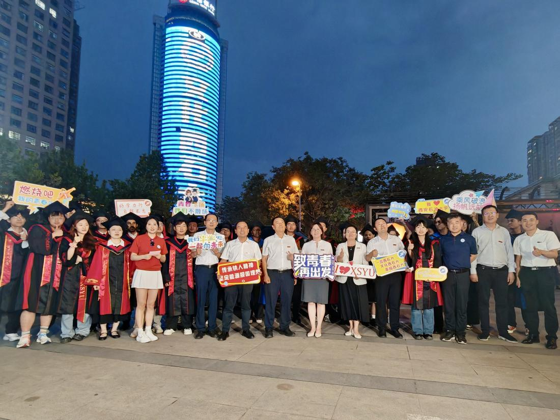 仲夏之夜,情滿石大。6月19日晚,“城市之窗”陜西信息大廈為西安石油大學(xué)2025屆畢業(yè)生點(diǎn)亮專屬祝福燈光,璀璨的“我?西安石油大學(xué)”字樣輝映古城。校黨委副書記程永清,副校長(zhǎng)種宇宏,黨委辦公室(校長(zhǎng)辦公室)、黨委組織部、黨委宣傳部、黨委學(xué)生工作部、黨委教師工作部、教務(wù)處、研究生工作部等部門負(fù)責(zé)人,輔導(dǎo)員、本碩博及留學(xué)生代表共同見證。