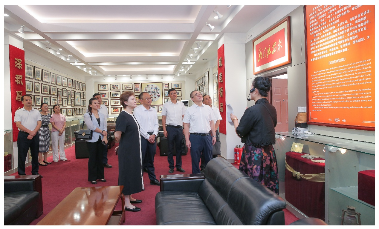 常江一行在陜西省戲曲研究院黨委書(shū)記、院長(zhǎng)李梅陪同下,先后參觀了院劇場(chǎng)、院史陳列室,觀摩了《戲曲薈萃表演》,系統(tǒng)了解了研究院自1938年延安陜甘寧邊區(qū)民眾劇團(tuán)發(fā)展至今的歷程,以及在秦腔藝術(shù)傳承、劇目創(chuàng)作、人才培養(yǎng)等方面的卓越成就,切身感受到陜西戲曲藝術(shù)的深厚底蘊(yùn)與獨(dú)特魅力。