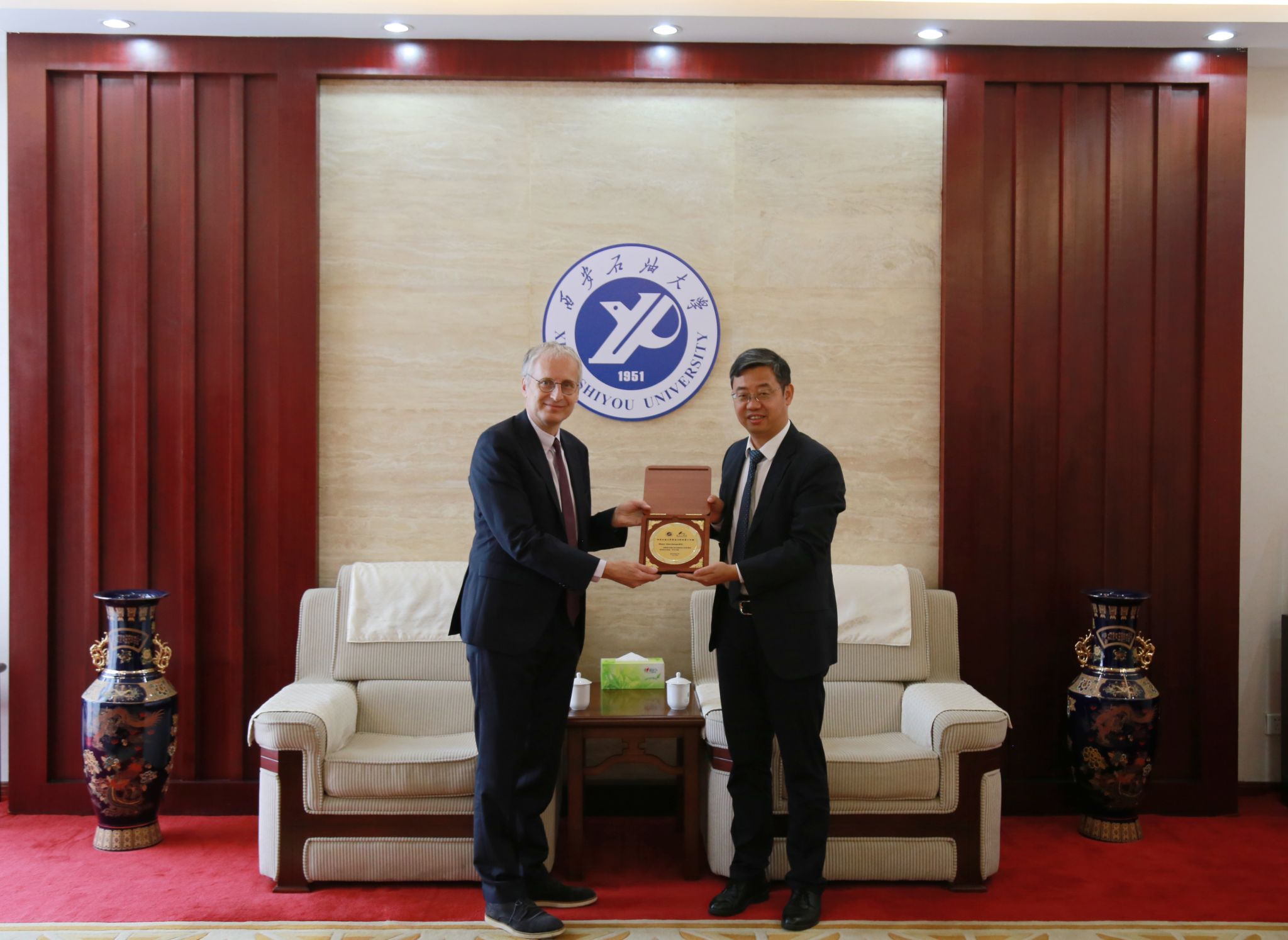 王進富代表學校對舍恩伯格教授的到訪表示熱烈的歡迎和衷心的感謝。他首先對能源行業(yè)面臨的智慧化問題、中國智慧油氣田開發(fā)發(fā)展現(xiàn)狀及我校目前致力于人工智能教學科研體系的改革作了簡要介紹,并表示希望通過此次交流,進一步提升我校人工智能領域的學科建設和科學研究水平。舍恩伯格教授對學校的邀請表達了感謝,并圍繞我校油氣能源、人工智能學科的發(fā)展、科研、人才培養(yǎng)等提出了建議。