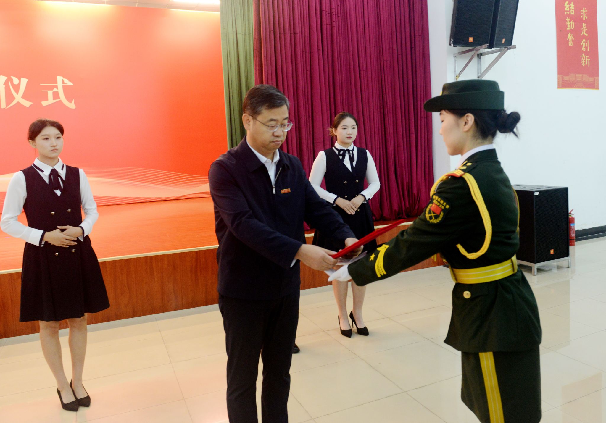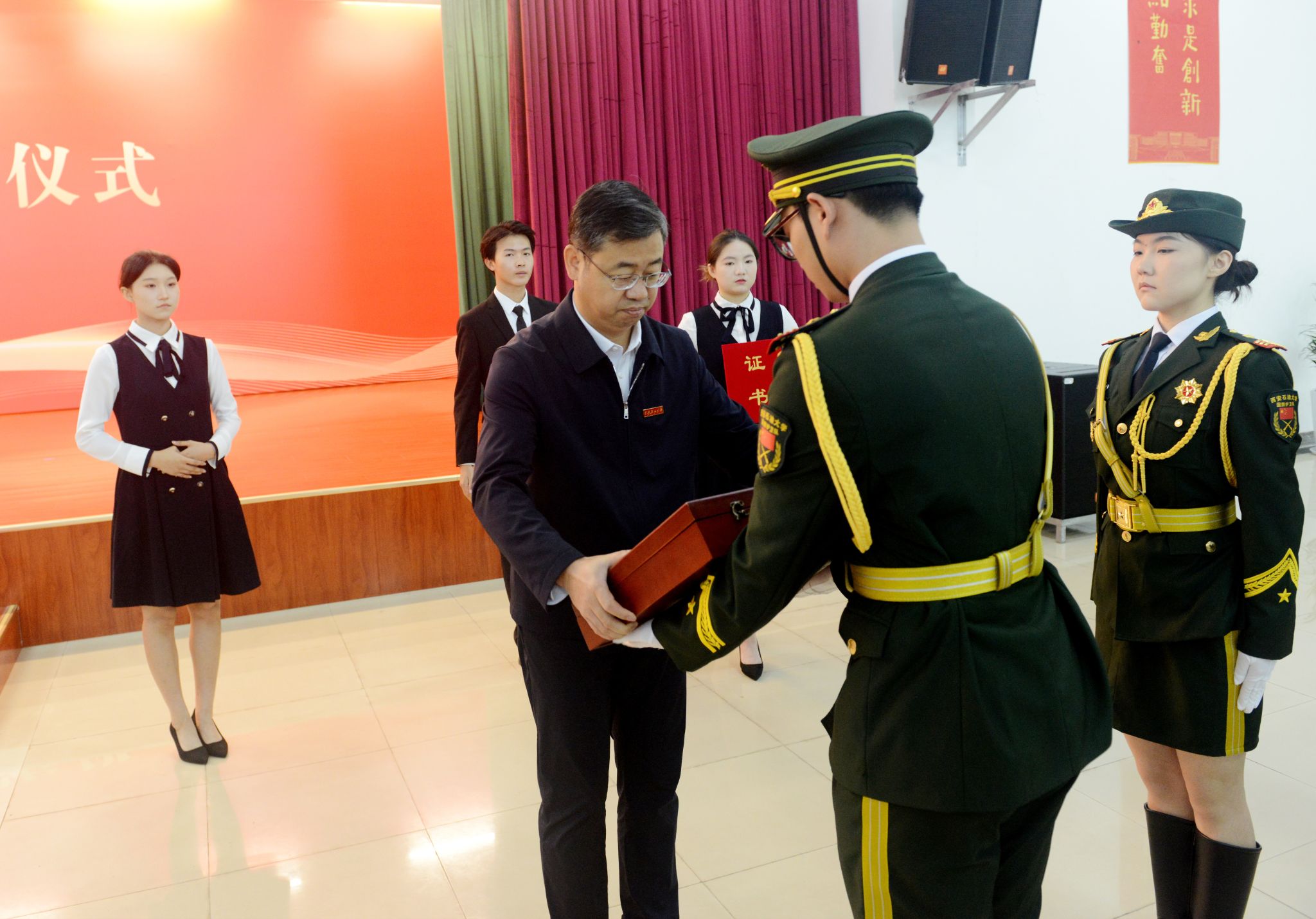 上午8時,儀式在莊嚴(yán)的氛圍中正式開始。校長王進富將獲贈的國旗及證書鄭重交予學(xué)校國旗護衛(wèi)隊,國旗護衛(wèi)隊隊員神情肅穆,步伐鏗鏘,莊嚴(yán)地護送國旗入場。這面國旗旗長5米、寬3.3米,為超大國旗,整幅旗面無拼接,五顆星由織造人員手工縫制,工藝特殊,承載著億萬中華兒女的深厚愛國情懷,也凝聚著我校建校70周年的特別紀(jì)念。
