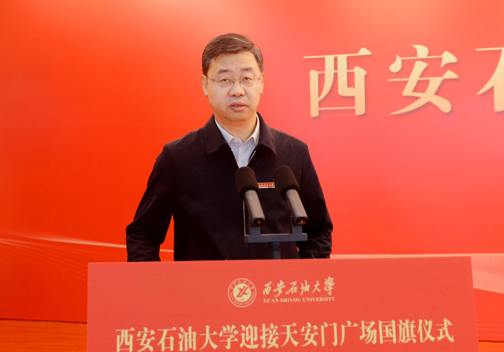 校長王進富發(fā)表致辭,他總結(jié)回顧了學(xué)校74年來與黨和國家同向同行、為祖國能源事業(yè)不懈奮斗的辦學(xué)歷程,強調(diào)學(xué)校始終“以‘石’為基、以‘油’鑄魂”, 在服務(wù)國家能源戰(zhàn)略中彰顯使命擔(dān)當(dāng),培養(yǎng)了一批又一批能源領(lǐng)域的棟梁之才。他向全體師生提出三點希望:一是希望全體師生高擎信仰之炬,把弘揚愛國主義精神作為永恒主題。要持續(xù)發(fā)揮好這面國旗的愛國主義教育功能,開展內(nèi)容豐富、形式多樣的愛國主義教育活動,營造愛黨愛國、愛校榮校的濃厚氛圍;二是希望全體師生堅定強國信念,把踐行奮斗實干擔(dān)當(dāng)作為精神底色。要堅持石油精神辦學(xué)、鐵人精神育人、延安精神鑄魂,秉承“愛國奉獻、艱苦奮斗、科學(xué)求實、開拓進取”的辦學(xué)精神,全面落實立德樹人根本任務(wù),不斷提升服務(wù)國家能源戰(zhàn)略與區(qū)域發(fā)展的能力,在教育強國建設(shè)中展現(xiàn)更大作為;三是希望全體師生挺膺擔(dān)當(dāng)之志,把矢志能源報國使命作為畢生追求。廣大教師要弘揚教育家精神,以赤誠之心、奉獻之心、仁愛之心教書育人,做學(xué)生成長的引路人,廣大學(xué)子要秉承“好學(xué)力行、自強不息”的校訓(xùn),傳承鐵人精神,將使命扛在肩頭,為國家能源事業(yè)貢獻青春力量。