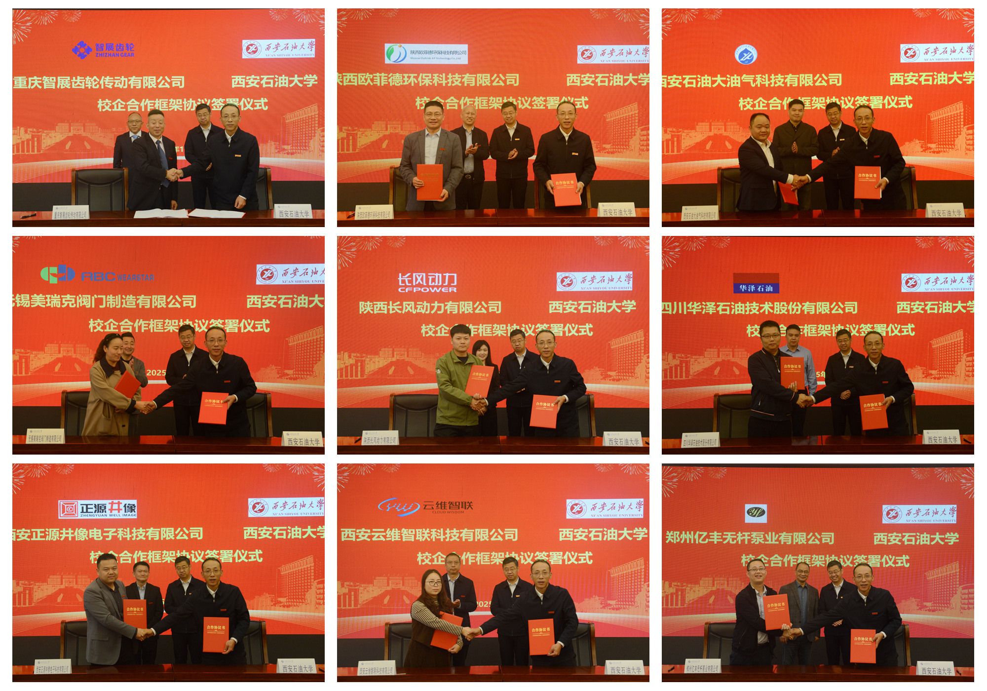 10月12日上午,我校在鄠邑校區(qū)隆重舉行校企合作簽約儀式暨企業(yè)技術(shù)需求發(fā)布會(huì)。校長(zhǎng)王進(jìn)富、校黨委副書記張木、副校長(zhǎng)張君濤及重慶智展齒輪傳動(dòng)有限公司董事長(zhǎng)何榮、陜西歐菲德環(huán)??萍加邢薰径麻L(zhǎng)卜濤、西安石油大油氣科技有限公司董事長(zhǎng)鄧鵬、陜西長(zhǎng)風(fēng)動(dòng)力有限公司總經(jīng)理王東芹、無錫美瑞克閥門制造有限公司總經(jīng)理孫海東、四川華澤石油技術(shù)股份有限公司總經(jīng)理張晨、西安正源井像電子科技有限公司總經(jīng)理王曉農(nóng)、西安云維智聯(lián)科技有限公司總經(jīng)理王紅春、鄭州億豐無桿泵業(yè)有限公司總經(jīng)理徐正國(guó)出席會(huì)議。會(huì)議由副校長(zhǎng)種宇宏主持。