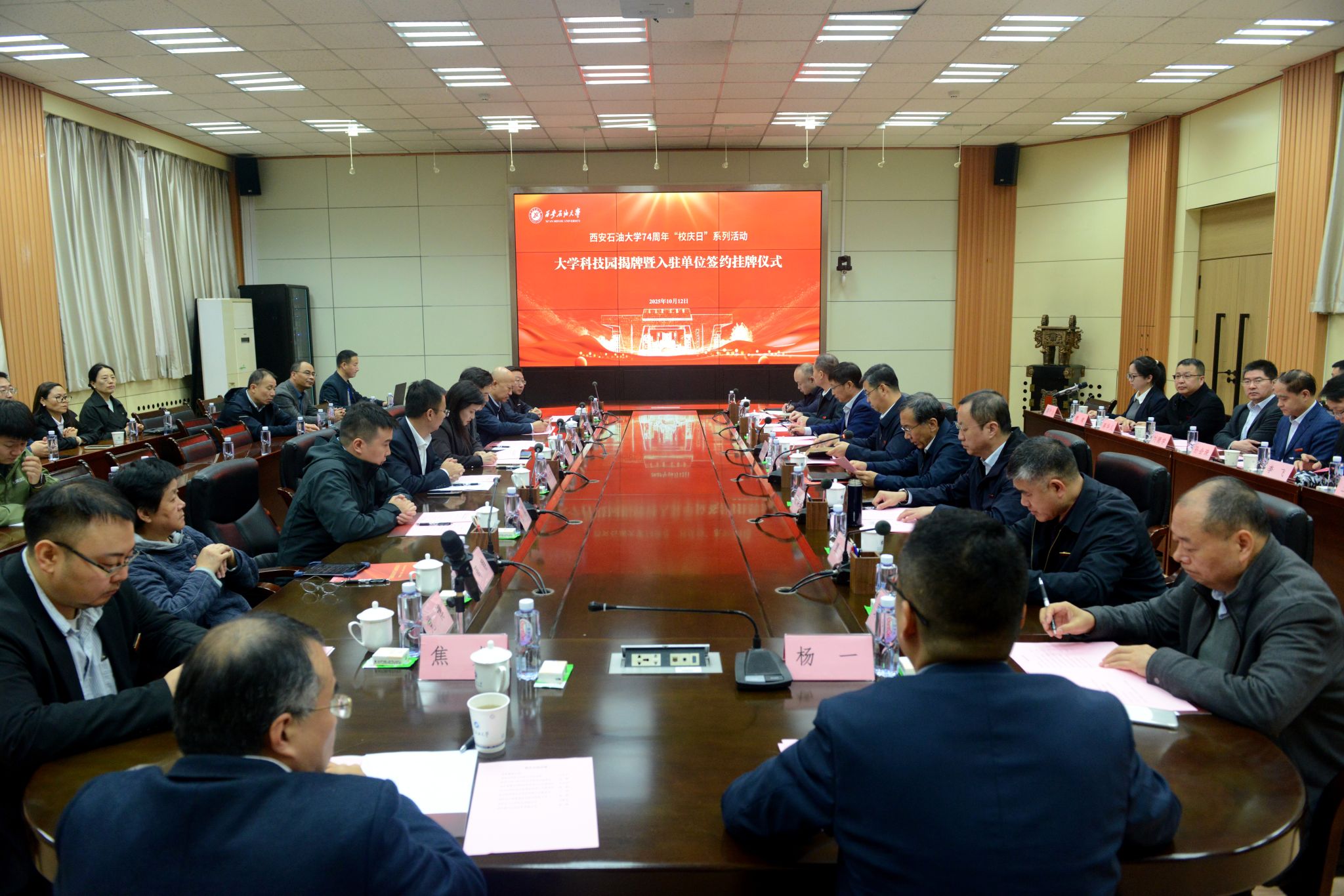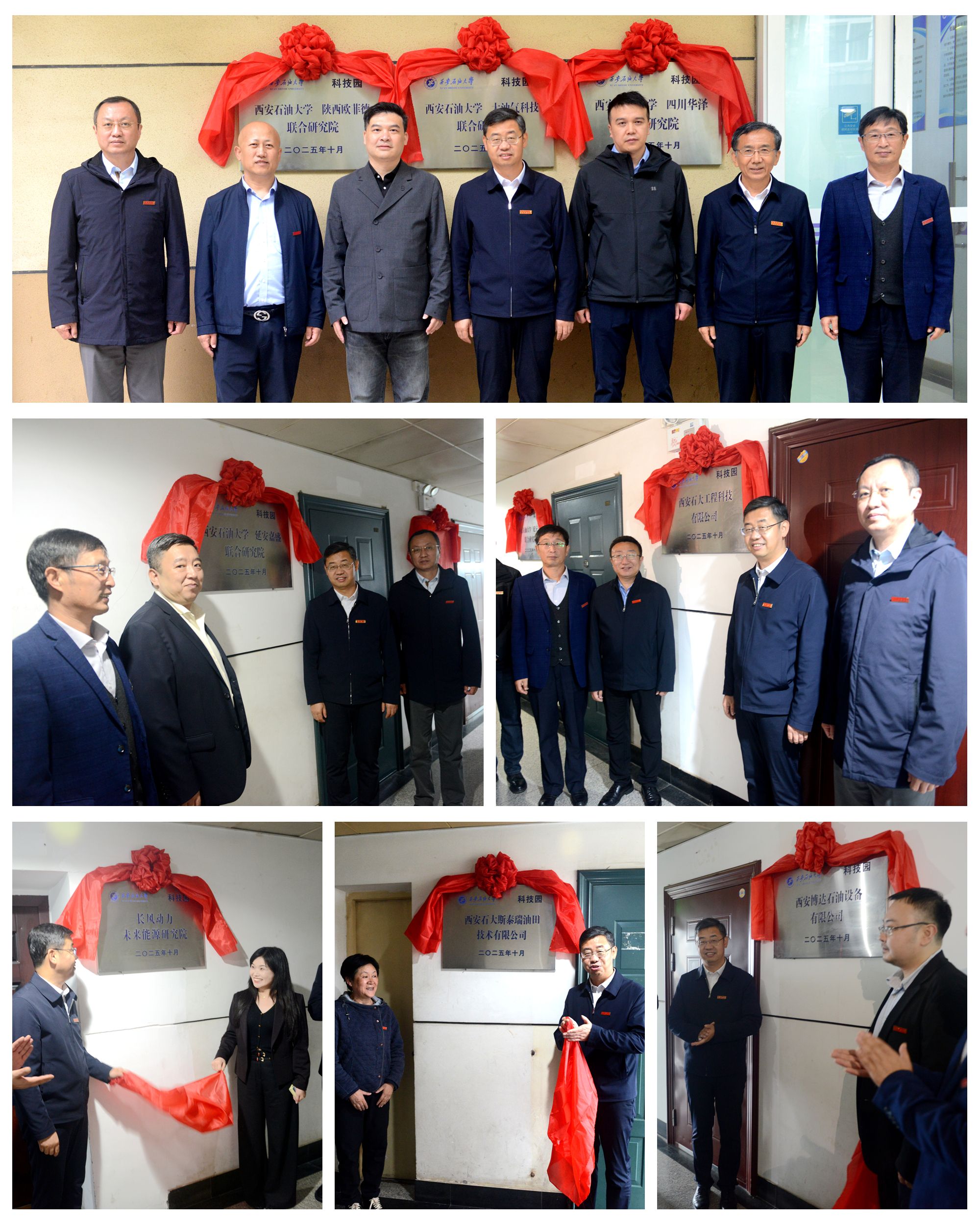 儀式的最后一個(gè)環(huán)節(jié),大學(xué)科技園揭牌儀式在東方石油樓舉行,王進(jìn)富、蘇文甫、張榮軍共同為“西安石油大學(xué)科技園”揭牌,并與各企業(yè)負(fù)責(zé)人一起為各入駐單位揭牌。