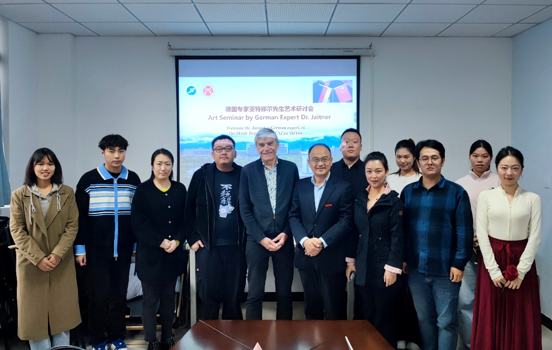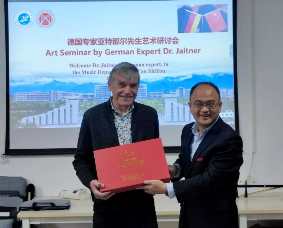在專業(yè)交流環(huán)節(jié),雙方圍繞藝術(shù)創(chuàng)新與國際合作展開深入對話。師生與Jaitner先生就傳統(tǒng)音樂傳承、音樂劇創(chuàng)作、爵士樂發(fā)展等核心議題進(jìn)行了專業(yè)探討。Jaitner先生結(jié)合國際視野提出建設(shè)性見解,為師生拓展了創(chuàng)作思路。會議還重點(diǎn)介紹了我校原創(chuàng)音樂劇《我為祖國找石油》,呈現(xiàn)音樂系在紅色題材藝術(shù)創(chuàng)作方面的探索成果。針對師生關(guān)注的德國留學(xué)與學(xué)術(shù)交流事宜,Jaitner先生詳細(xì)介紹了德國相關(guān)教育資源與文化環(huán)境,為有意赴德深造的師生提供了實(shí)用參考。
