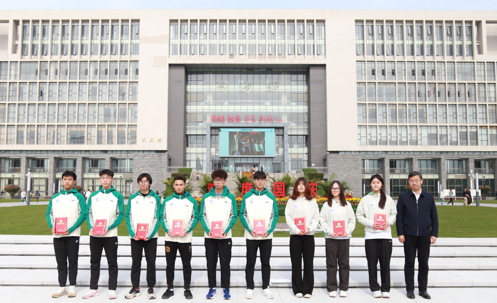 儀式上,王進富、張驍勇、種宇宏分別為校田徑隊和健美隊的運動員們頒發(fā)了參賽榮譽證書。