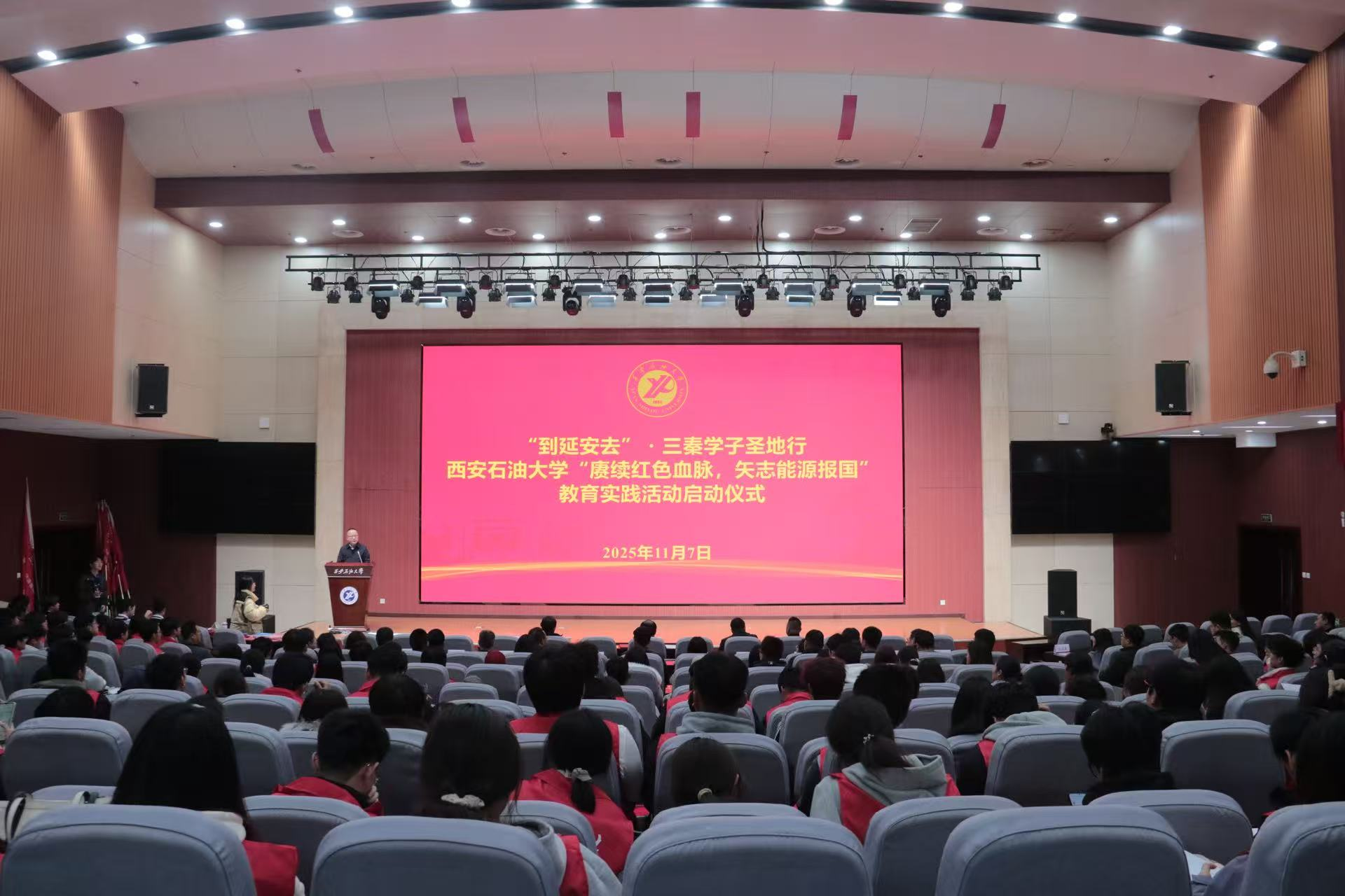 為深入貫徹習(xí)近平總書記關(guān)于“延安精神是黨的寶貴精神財富,要代代傳承下去”的重要指示精神,用好延安革命圣地豐富的紅色資源,充分發(fā)揮育人作用,根據(jù)陜西省委教育工委《關(guān)于組織開展“到延安去”·三秦學(xué)子圣地行活動的通知》要求,推動紅色文化資源深度融入“大思政課”建設(shè)和立德樹人全過程,11月7日下午,學(xué)校在鄠邑校區(qū)弘石學(xué)術(shù)報告廳舉行“到延安去”?三秦學(xué)子圣地行—西安石油大學(xué)“賡續(xù)紅色血脈,矢志能源報國”教育實(shí)踐活動啟動儀式。副校長種宇宏出席儀式并講話,黨委組織部、黨委學(xué)生工作部、校團(tuán)委、馬克思主義學(xué)院、繼續(xù)教育學(xué)院等單位負(fù)責(zé)人,各院(系)學(xué)生工作負(fù)責(zé)人,團(tuán)委(團(tuán)總支)書記,學(xué)生黨支部書記及預(yù)備黨員代表,第十八期校級青年馬克思主義者干部培訓(xùn)班優(yōu)秀學(xué)員代表,團(tuán)學(xué)骨干代表,2025級班級團(tuán)支部書記代表400余人參加儀式。