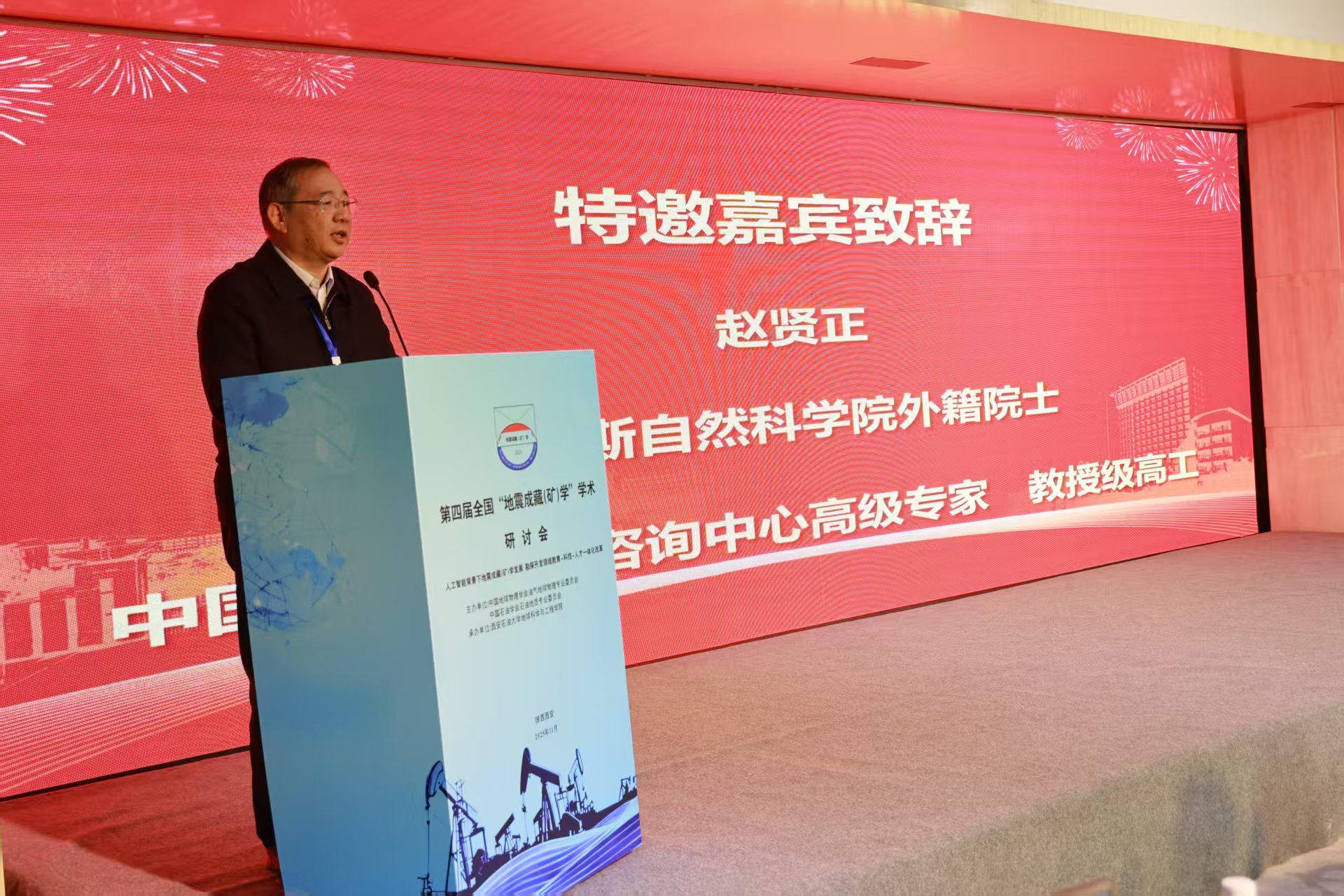 特邀嘉賓俄羅斯自然科學院外籍院士、中國石油集團咨詢中心高級專家趙賢正教授代表會議主辦單位致辭。趙賢正表示,地震成藏(礦)學自2009年提出以來,已在理論與技術(shù)上取得顯著進展,成為指導(dǎo)復(fù)雜地質(zhì)條件下油氣勘探的重要支撐,并呼吁廣大科技工作者加強學科交叉與產(chǎn)學研合作,推動該學科向縱深發(fā)展,為我國能源勘探開發(fā)提供更強有力的理論和技術(shù)保障。