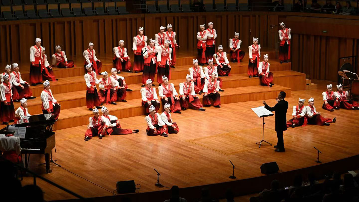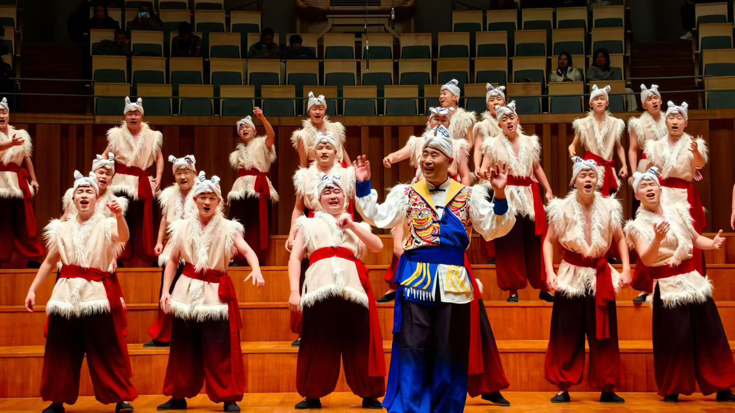 在本次演出過程中,我校合唱團以陜北民歌這一國家級非物質(zhì)文化遺產(chǎn)為核心,通過現(xiàn)代合唱藝術語匯,先后合唱了《黃河船夫曲》《走西口》《神仙擋不住人想人》等具有鮮明地域特色十首歌曲,彰顯了陜北民歌的原始生命力與文化深度,展現(xiàn)了傳統(tǒng)民歌與現(xiàn)代編創(chuàng)的相映生輝,實現(xiàn)了非遺的“活態(tài)傳承”。作為整場演出的點睛之筆,承載了幾代石油人記憶的經(jīng)典作品《我為祖國獻石油(新編》》通過合唱藝術的重新演繹,煥發(fā)出新的生命力。當熟悉的旋律在國家大劇院音樂廳回蕩,高亢的信天游與鏗鏘的石油贊歌交織共鳴,既彰顯西北文化的雄渾氣魄、石油文化的奉獻底色與能源報國的赤子情懷,更是學校辦學理念的生動藝術表達,贏得了全場雷鳴般的掌聲。