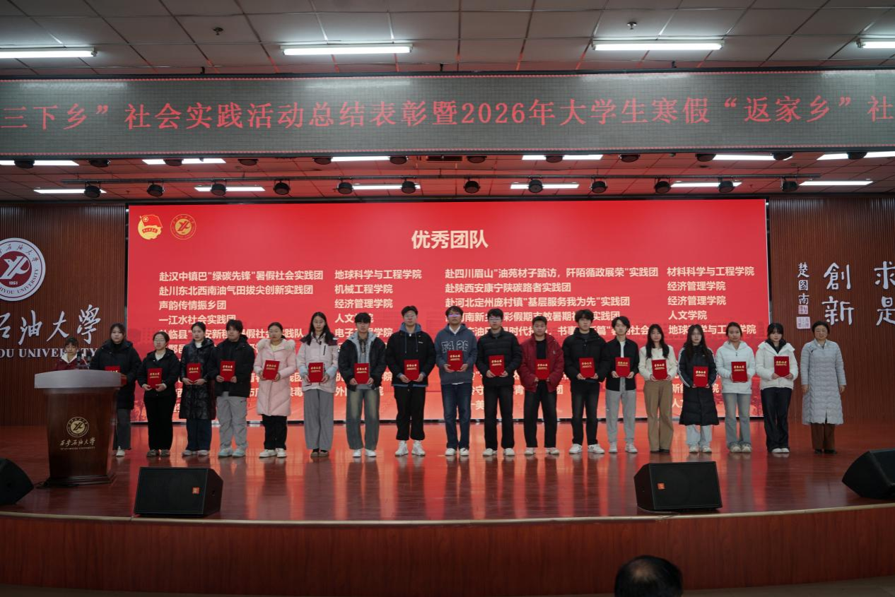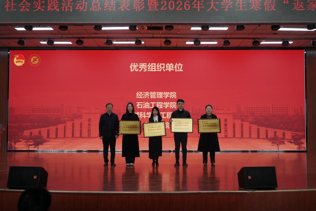種宇宏為2026年大學(xué)生寒假“返家鄉(xiāng)”社會實踐團(tuán)隊代表授旗,校團(tuán)委負(fù)責(zé)人宣讀了《關(guān)于2025年大學(xué)生暑期“三下鄉(xiāng)”社會實踐活動總結(jié)表彰的通知》《關(guān)于開展西安石油大學(xué)2026年大學(xué)生寒假“返家鄉(xiāng)”社會實踐的通知》,與會部門負(fù)責(zé)人分別為2025年大學(xué)生暑期“三下鄉(xiāng)”社會實踐先進(jìn)個人代表、優(yōu)秀團(tuán)隊、標(biāo)兵團(tuán)隊、優(yōu)秀指導(dǎo)老師、優(yōu)秀組織單位頒獎。電子工程學(xué)院自動化2402班張晨曦同學(xué)、經(jīng)濟(jì)管理學(xué)院國貿(mào)2301班權(quán)雨晨同學(xué)分別代表2025年大學(xué)生暑期“三下鄉(xiāng)”社會實踐獲獎團(tuán)隊和2026年大學(xué)生寒假“返家鄉(xiāng)”社會實踐團(tuán)隊作了交流發(fā)言。